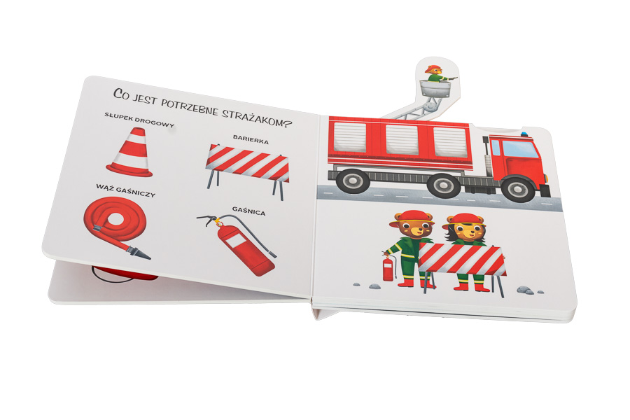 Maluch będzie poznawał pracę strażaków i nauczy się wielu nowych słów. Dowie się, jak są ubrani strażacy, co robia kiedy słyszą alarm i jak wygląda akcja ratunkowa.
