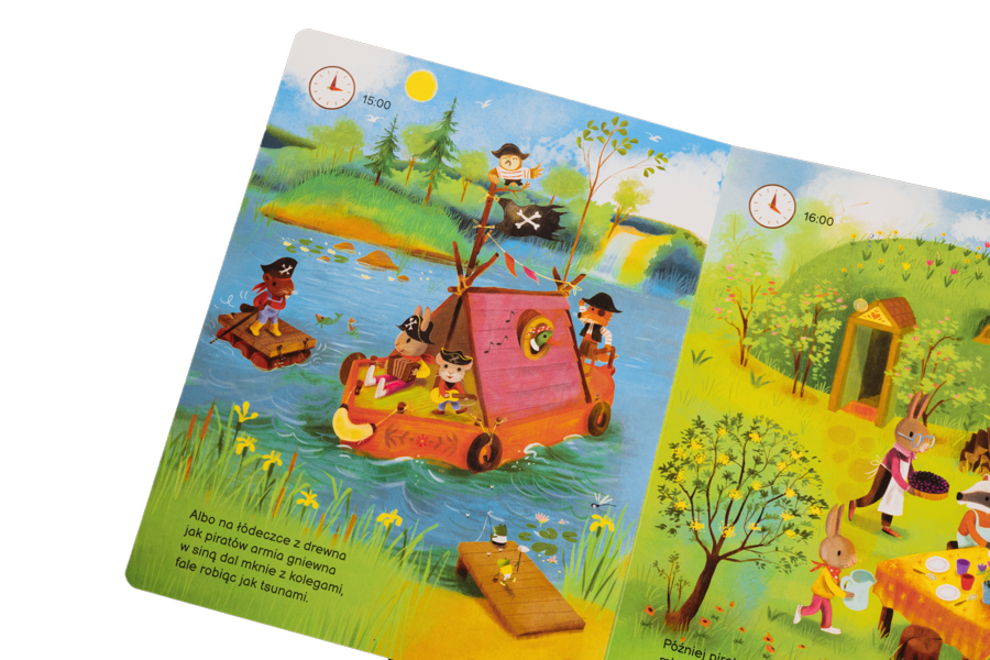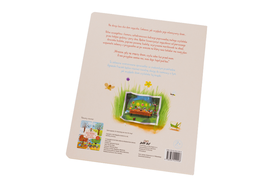 Pełne szczegółów i humoru, całostronicowe ilustracje poprowadzą małego czytelnika przez kolejne godziny i pory dnia. Będzie towarzyszyć zajączkowi od pierwszego dzwonka budzika, poprzez poranną toaletę, wyrywanie marchewek na obiad, wspaniałe zabawy z przyjaciółmi aż po wieczór, na który nasz bohater ma swój plan: