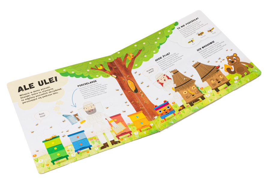 Urocza kartonowa książeczka z pomysłowymi wycięciami zaprasza dzieci do fascynującego świata pszczół. Dzięki jej barwnym i pełnym humoru stronom dzieci poznają wiele słodkich jak miód ciekawostek i poczują się, jakby zaglądały do wnętrza ula. Bzz, bzz! Ale ule! Ale zabawa! Bajecznie kolorowe strony książeczki zaciekawią dzieci otaczającym je światem i pięknem przyrody i zapewnią im rozwijającą i bezpieczną rozrywkę.