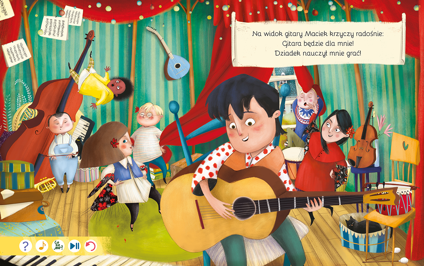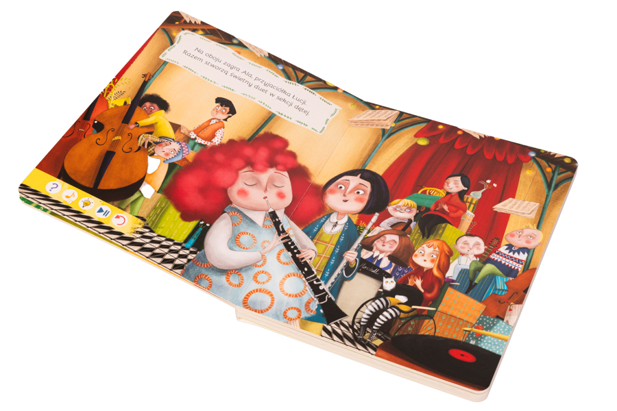 Rodzina Marty prowadzi sklep muzyczny, który odwiedzają jej przyjaciele, ponieważ chcą założyć orkiestrę. Kto zagra na jakim instrumencie? Jak brzmi flet, a jak klarnet? Czym się różnią skrzypce od wiolonczeli? Jaki instrument odnaleziono w grobowcu faraona? Młodzi czytelnicy znajdą w tej książce odpowiedzi na te i inne pytania. Posłuchają także wielu melodii w wykonaniu poszczególnych instrumentów klasycznych, a nawet całej orkiestry! Wędrując po zakamarkach pełnego niespodzianek i tajemnic sklepu, będą odkrywać piękno i bogactwo dźwięków, a odpowiadając na pytania, sprawdzą swoją wiedzę o instrumentach.