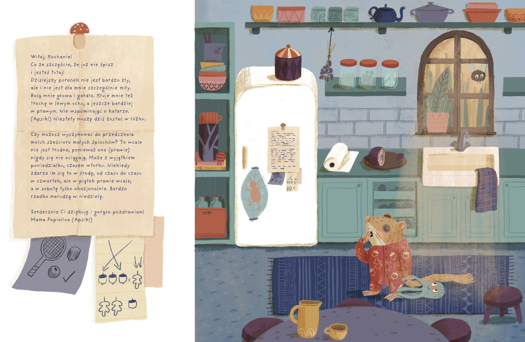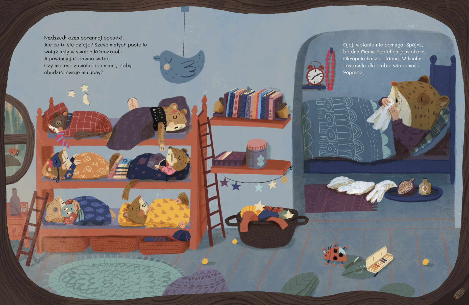 Tego dnia Mama Popielica obudziła się z bólem głowy i gardła. Okropnie kaszle i kicha. (Apsik!) Niestety musi zostać w łóżku... Także sześć małych popielic wciąż leży w swoich łóżeczkach. A przecież nadszedł już czas porannej pobudki. Pora wstawać! Kto wyszykuje do przedszkola gromadkę niesfornych śpiochów?