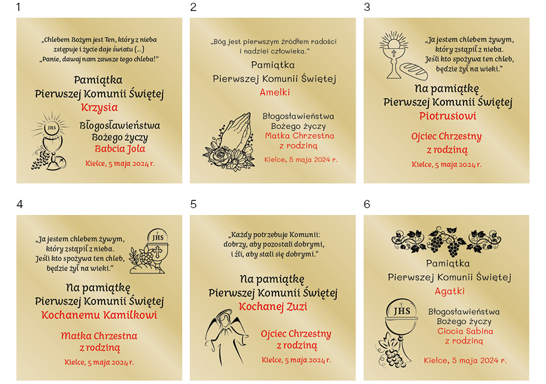 Grawer wykonany metodą laserową na eleganckiej aluminiowej tabliczce koloru złotego w rozmiarze 75x75 mm. Może być wklejony na wewnętrzną stronę pudełka ozdobnego lub Biblii. Do wyboru sześć różnych wzorów grawera. Prosimy o podanie w uwagach do zamówienia następujących danych do personalizacji: numeru wzoru grawera, imię dziecka, nazwę osoby obdarowującej, datę uroczystości. Na przykład: