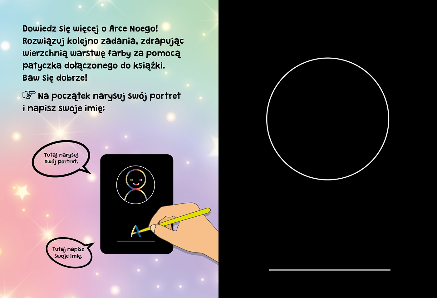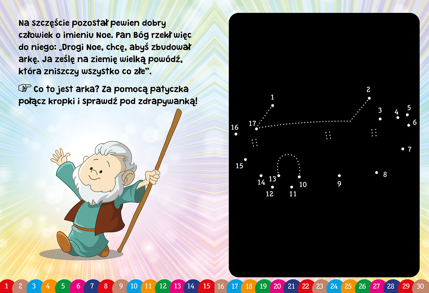 Dowiedz się więcej o Arce Noego! Rozwiązuj kolejno zadania, zdrapując wierzchnią warstwę farby za pomocą patyczka dołączonego do książki. Baw się dobrze!