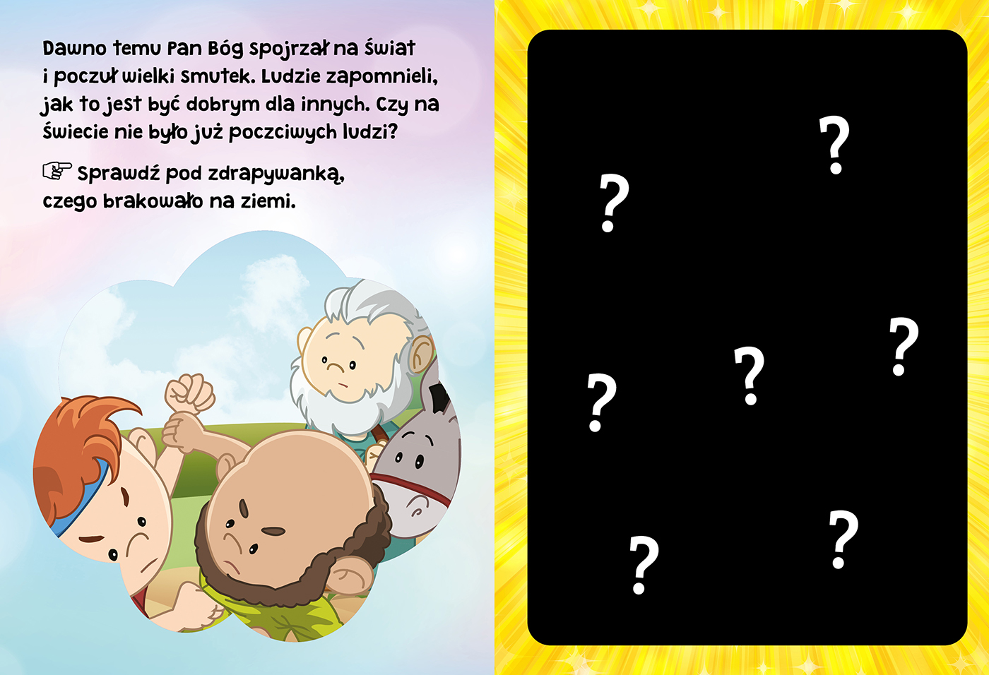 W tej kartonowej książeczce dziecko znajdzie mnóstwo aktywności, które polegają na zdrapywaniu czarnej farby pokrywającej kolejne kartki, aby wykonać zadanie i odkryć, co znajduje się pod spodem. Do każdego zeszytu dołączony jest plastikowy patyczek, dzięki czemu wszystko, co potrzebne do zabawy, jest zawsze pod ręką. Twarda oprawa i spiralny grzbiet sprawiają, że książeczka jest idealna do zabrania ze sobą, by wypełnić czas ciekawymi zadaniami. To świetne połączenie: rozwijanie kreatywności i poznawanie Biblii w tym samym czasie.