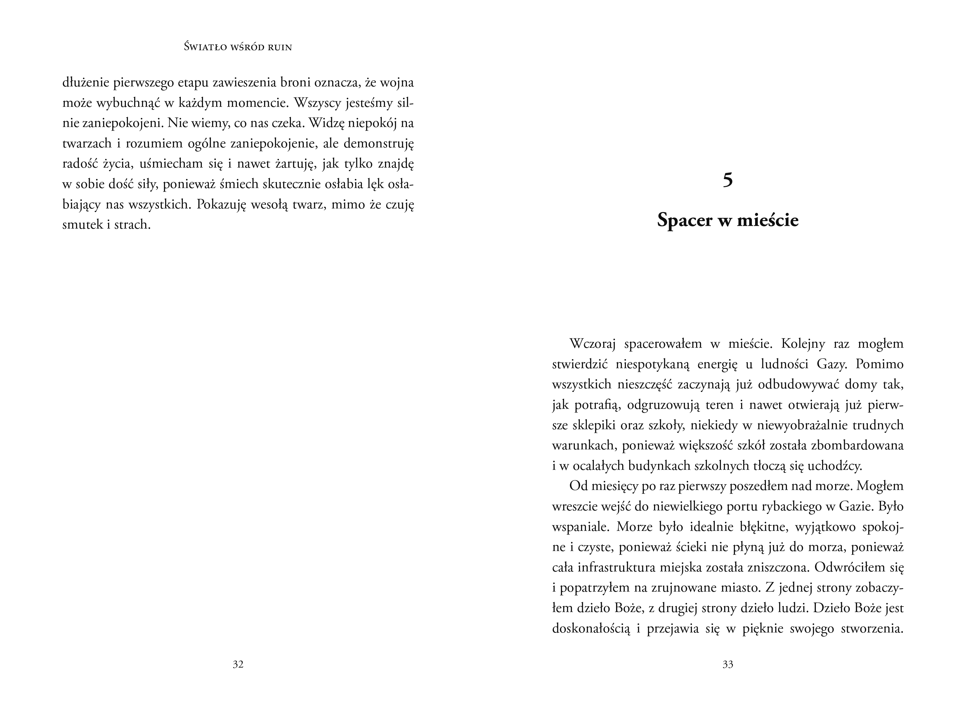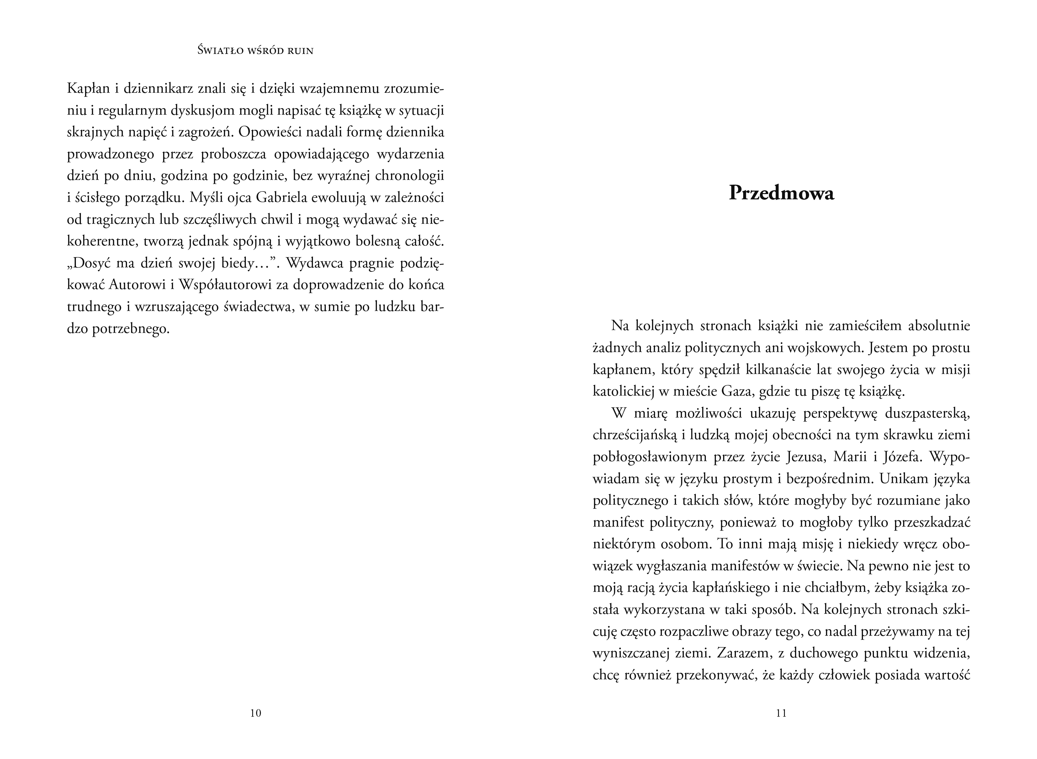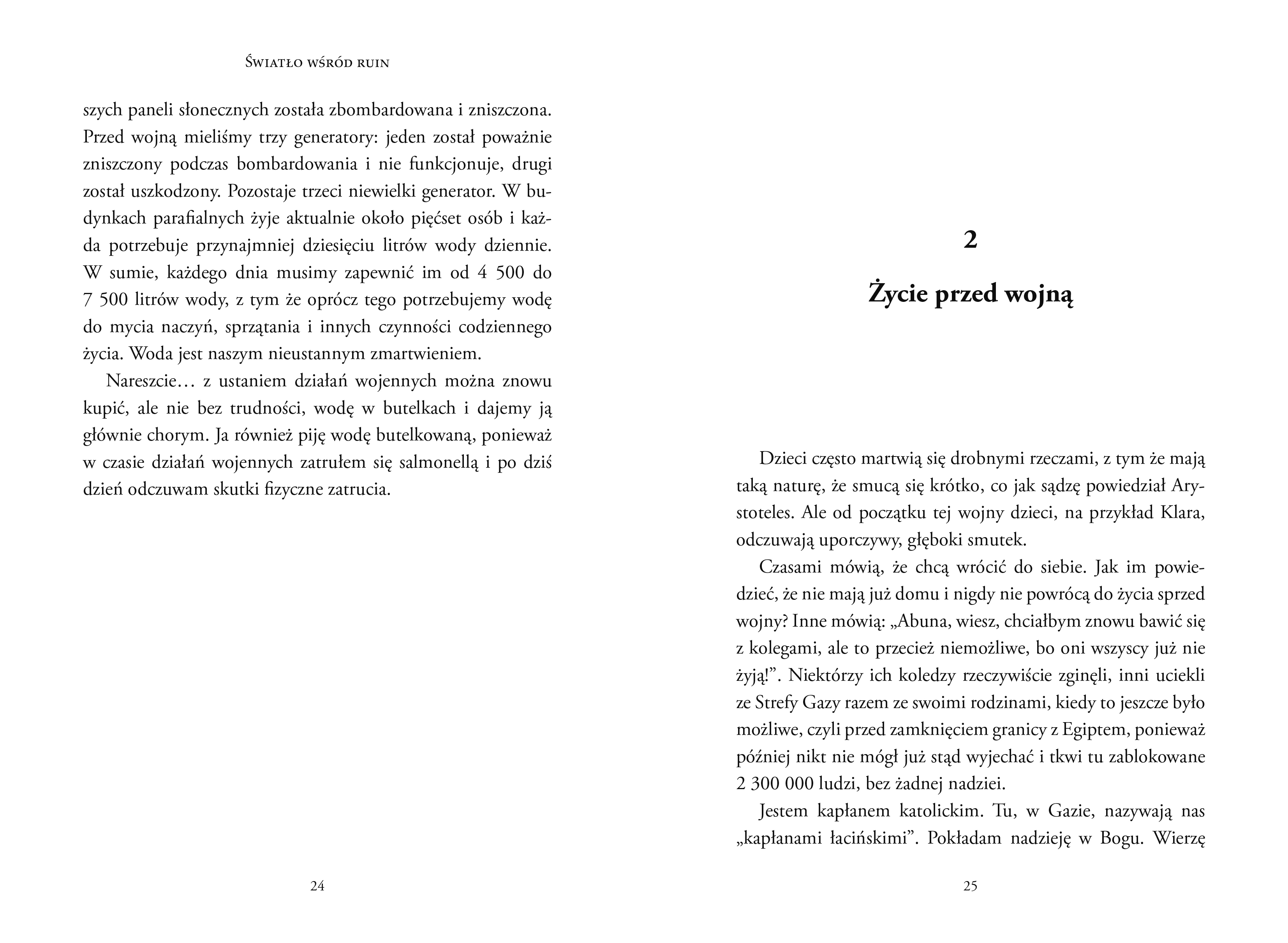 W środku Gazy, na północ od palestyńskiej enklawy spustoszonej przez bombardowania, stoi kościół Świętej Rodziny. Dziesiątki rodzin tłoczą się tutaj codziennie, by znaleźć schronienie, próbując przetrwać od czasu reakcji Izraela na atak terrorystyczny Hamasu 7 października 2023 roku. Każdego dnia ludzie modlą się, by krzyż, który sięga wysoko w niebo, odwrócił pociski. Każdego dnia, z uśmiechem lub uściskiem, Ojciec Gabriel Romanelli, jedyny ksiądz w Gazie, który odmówił opuszczenia swojego kościoła i mieszkańców zniszczonej enklawy, wita wszystkich uchodźców w poszukiwaniu odrobiny pociechy, nadziei i promienia światła pośród ruin i śmierci. Papież Franciszek dzwonił do Ojca Gabriela codziennie przez ponad 18 miesięcy, aż do Wielkiej Soboty 2025 roku, by zaoferować mu wsparcie i podziękować za jego działania w parafii. Zraniony, gdy izraelska bomba spadła na jego kościół w połowie lipca, Ojciec Gabriel jest teraz świadkiem obecnego i krytycznego punktu zwrotnego z akceptacją planu pokojowego dla Gazy na ziemi, która prawdopodobnie pozostanie krajem ruiny i rozpaczy przez wiele miesięcy. W tym wyjątkowym i głęboko poruszającym opowiadaniu ze zniszczonego kraju, Ojciec Gabriel opowiada o swoim codziennym życiu: o życiu człowieka, który, wbrew wszelkim przeciwnościom, pomaga mężczyznom, kobietom i dzieciom przetrwać w sercu trwającego konfliktu o międzynarodowym zasięgu.