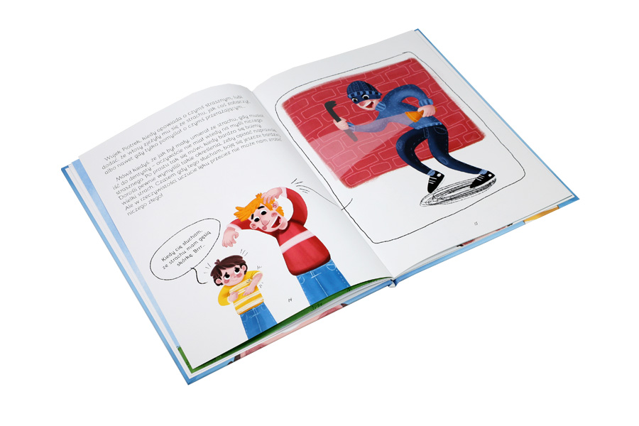 Książka na pierwszy rzut oka wydaje się dość niepozorna, ale na jej stronach znajdziemy wszystko to, co moim zdaniem, powinno się znaleźć w książce o takiej tematyce. I tak mamy tu informacje o tym, że to normalne odczuwać lęk, bo każdy się czegoś boi. Informacje o tym, jak różne osoby reagują na strach – klasykę w postaci szybkiego bicia serca, zamierania w bezruchu, ucieczki, ale i ucisku w gardle (i tu genialna grafika, która myślę trafi do każdego dziecka z mutyzmem wybiórczym!) czy bólach brzucha. Książka mówi też o tym, że gdy się czegoś boimy, to niebezpieczeństwo wydaje nam się dużo większe niż w rzeczywistości. Opowiada skąd może brać się strach i jak zmienia nasz sposób postrzegania rzeczywistości oraz podpowiada, co możemy zrobić, gdy się boimy, i w jaki sposób oswoić trudne sytuacje. A wszystko to w lekkiej, prostej i pełnej empatii narracji prowadzonej przez małego Franka, która zdecydowanie trafia w gust młodego odbiorcy. Świadczyć o tym może chociażby fakt, że w ciągu ostatnich dwóch tygodni czytałam ją z córką co najmniej 159 razy i obie znamy już ją chyba na pamięć ;).”