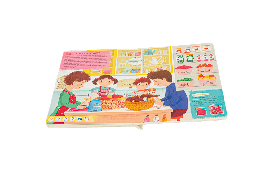 Mały czytelnik oglądając piękne i pełne szczegółów ilustracje Anny Simeone, poznaje kolejne pory roku. Słucha ciekawych informacji, obserwuje budzącą się do życia przyrodę, słyszy głosy ptaków i szum rzeki, towarzyszy bohaterom na wakacjach, wyrusza z nimi na spacer do jesiennego lasu, uczestniczy w przygotowaniach do świąt i słucha kolędy.