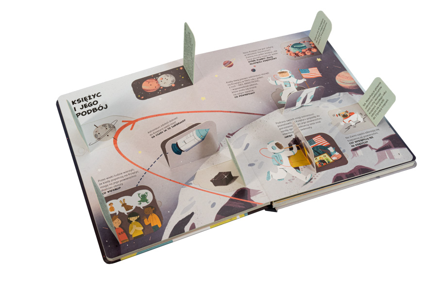 Dzieci poznają odpowiedzi na wiele pytań, m.in. Skąd przylatują komety? Jak wygląda życie wewnątrz stacji kosmicznej? Co by się stało, gdybyśmy znaleźli się zbyt blisko czarnej dziury? Podnosząc klapki, znajdą również mnóstwo ciekawostek o Układzie Słonecznym i niesamowitych tajemnicach kosmosu.