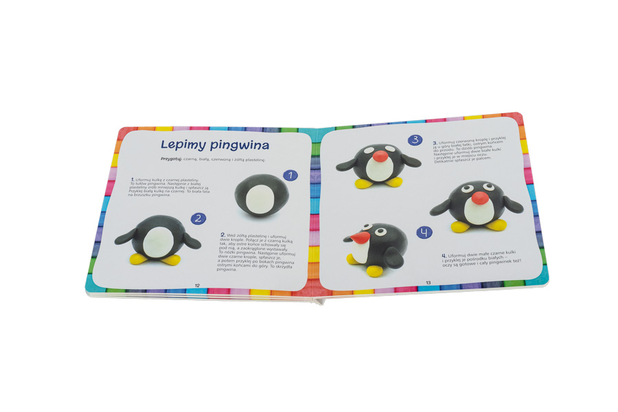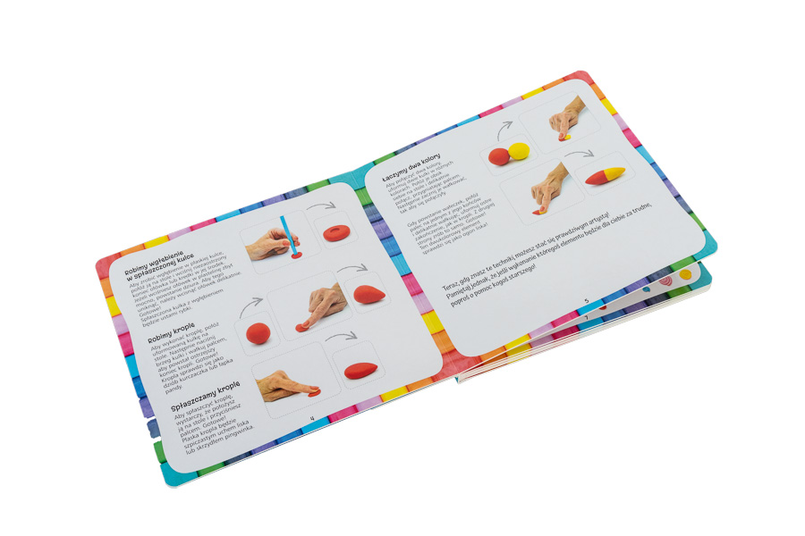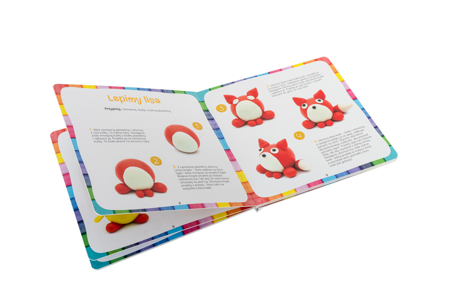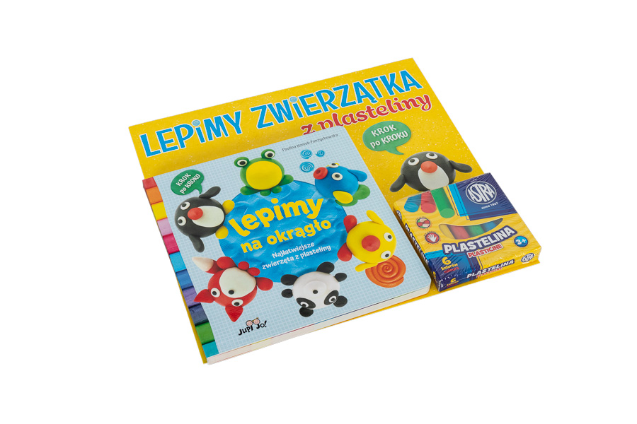 Pakiet zawiera: książeczke, plastelinę 6 kolorów oraz kartonową podkładke, na której dzieci mogą lepić zwierzątka.