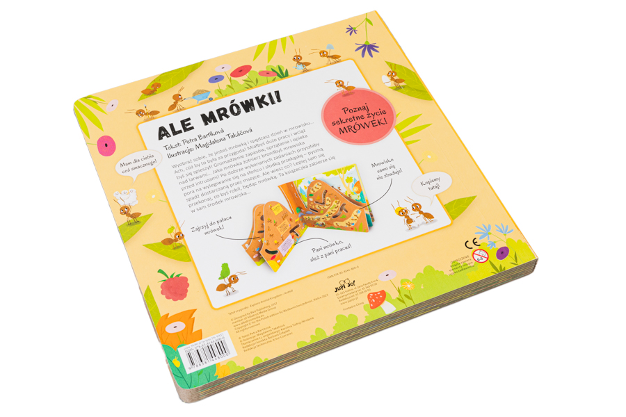 Urocza kartonowa książeczka z pomysłowymi wycięciami zaprasza dzieci do fascynującego świata mrówek. Dzięki jej barwnym i pełnym humoru stronom dzieci poznają wiele frapujących ciekawostek i poczują się, jakby zaglądały do wnętrza mrowiska. Och! Ale mrówki! Ale zabawa! Bajecznie kolorowe strony książeczki zaciekawią dzieci otaczającym je światem i pięknem przyrody i zapewnią im rozwijającą i bezpieczną rozrywkę.