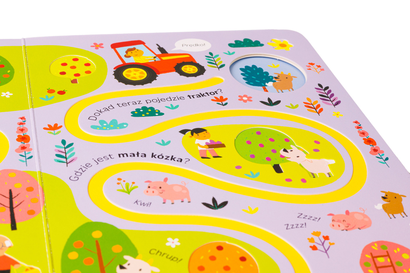 W każdej z nich spotka rżące, kwiczące i beczące zwierzęta gospodarskie! Odpowie na pytania, znajdzie też rzeczy do odkrycia i policzenia. Mały czytelnik będzie dotykał wykrojonych kształtów, a przez wycięte w kartkach dziurki zajrzy na kolejne strony i dowie się, dokąd zmierza traktor!