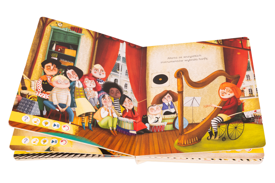 Rodzina Marty prowadzi sklep muzyczny, który odwiedzają jej przyjaciele, ponieważ chcą założyć orkiestrę. Kto zagra na jakim instrumencie? Jak brzmi flet, a jak klarnet? Czym się różnią skrzypce od wiolonczeli? Jaki instrument odnaleziono w grobowcu faraona? Młodzi czytelnicy znajdą w tej książce odpowiedzi na te i inne pytania. Posłuchają także wielu melodii w wykonaniu poszczególnych instrumentów klasycznych, a nawet całej orkiestry! Wędrując po zakamarkach pełnego niespodzianek i tajemnic sklepu, będą odkrywać piękno i bogactwo dźwięków, a odpowiadając na pytania, sprawdzą swoją wiedzę o instrumentach.