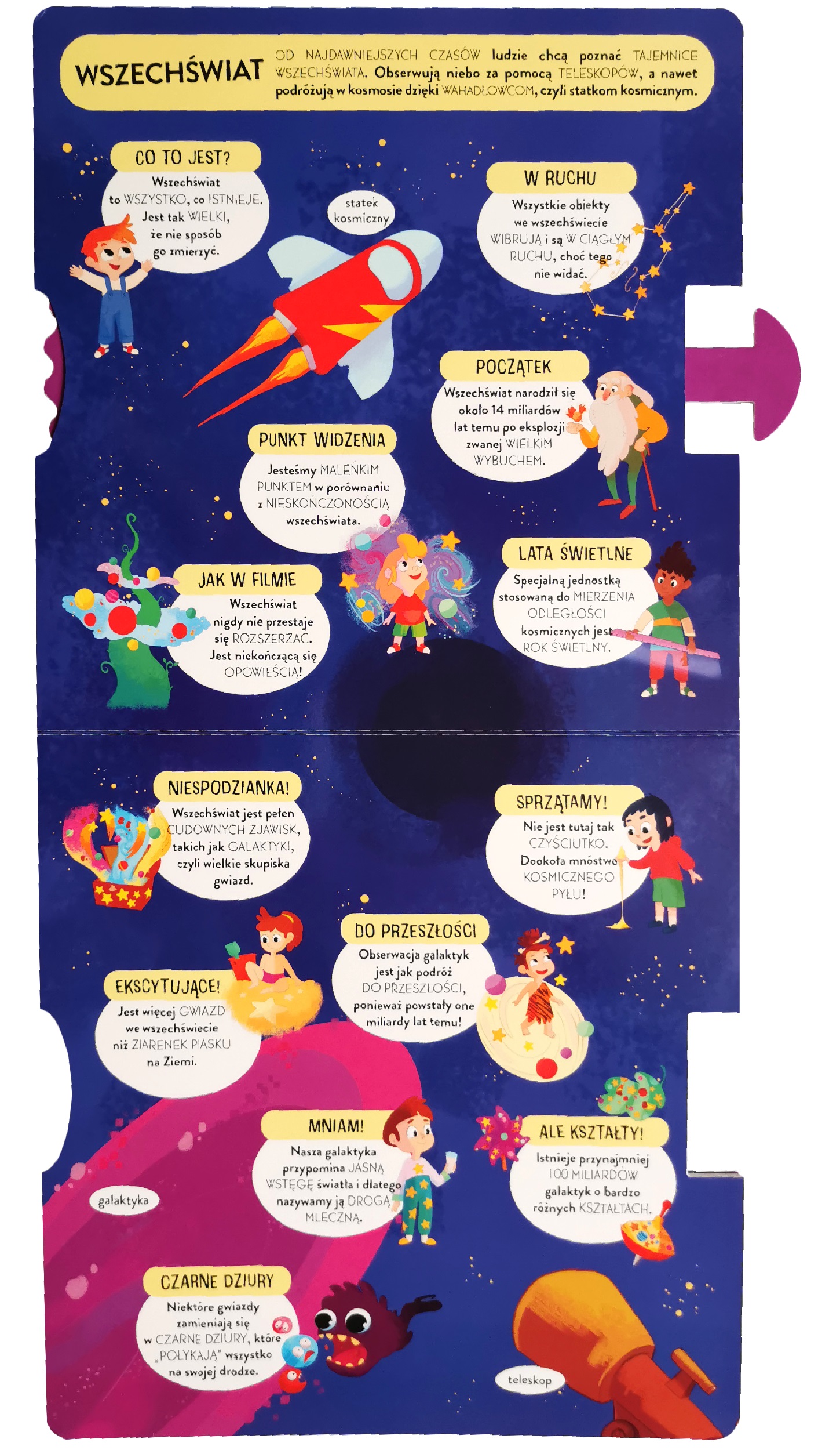 Na kolejnych stronach młody czytelnik będzie odkrywał zaskakujące tajemnice kosmosu i pozna mnóstwo fascynujących faktów o wszechświecie.
