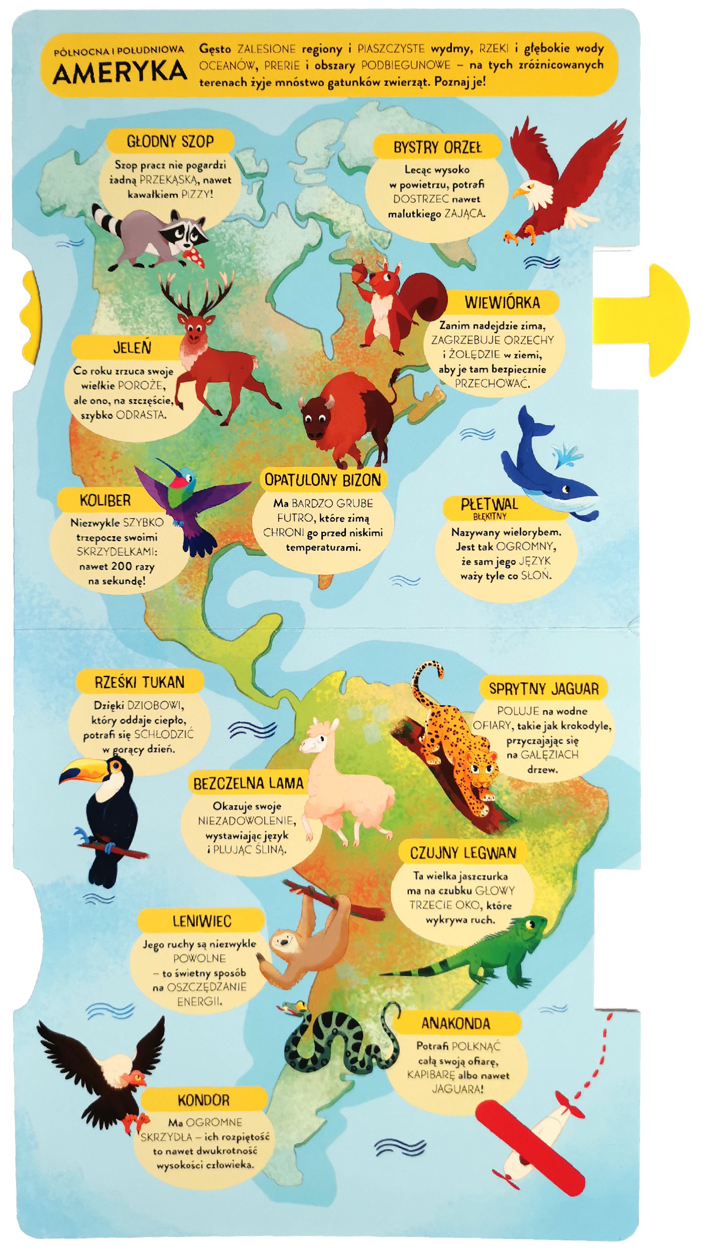 Integralną częścią tej wyjątkowej książki jest umieszczona w okładce gra zręcznościowa, w której dziecko pilotuje samolot lecący dookoła świata i jednocześnie mija różne zwierzęta. Ta zabawa świetnie wpływa na rozwój motoryki, koordynacji i spostrzegawczości gracza. Na kolejnych stronach młody czytelnik pozna zwierzęta zamieszkujące poszczególne kontynenty i odkryje zaskakujące fakty o ich życiu.