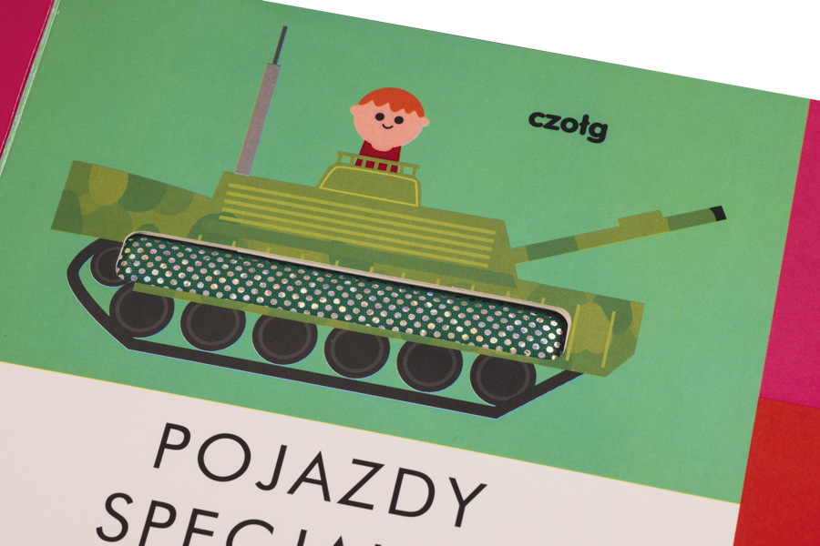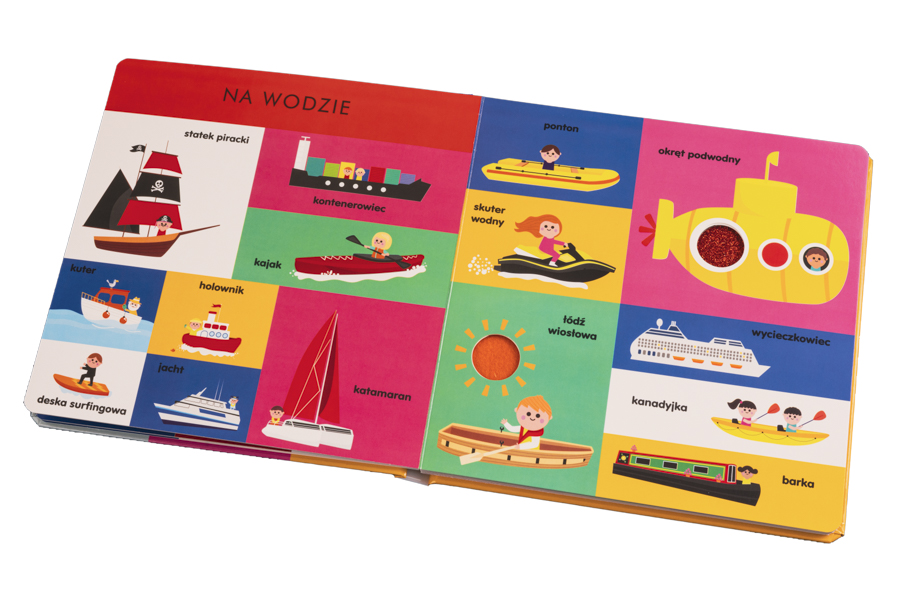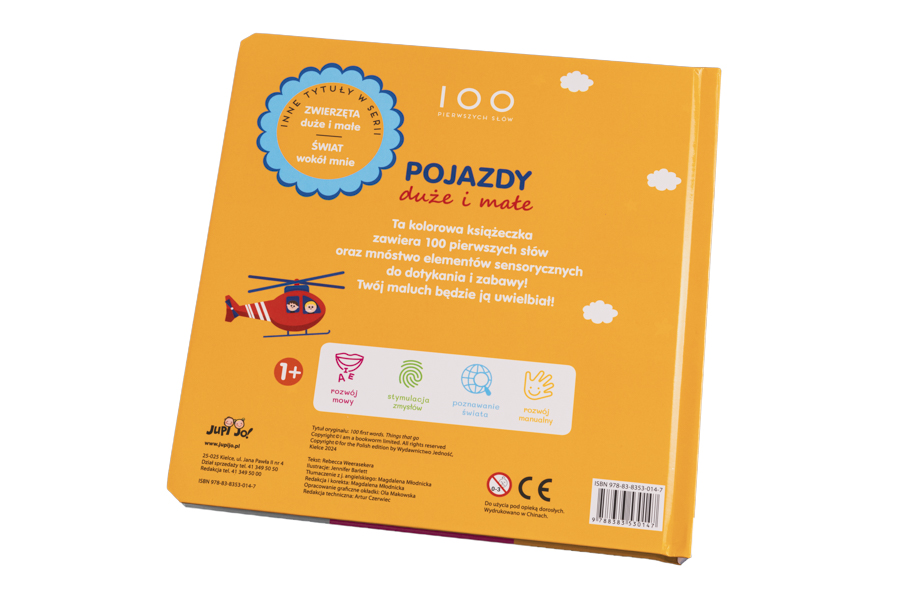 To tętniąca kolorami książka, w której najmłodsi znajdą 100 pojazdów. Mnóstwo zabawy zapewnią elementy sensoryczne znajdujące się na każdej rozkładówce: materiały o różnych strukturach, mięciutkie futerka, mieniące się brokaty, wycięte kształty. Maluchy będą bawić się, poznając pojazdy ratunkowe i budowlane, przemieszczające się po lądzie, wodzie i powietrzu, używane przez dorosłych i dzieci. Zabawę czas zacząć.