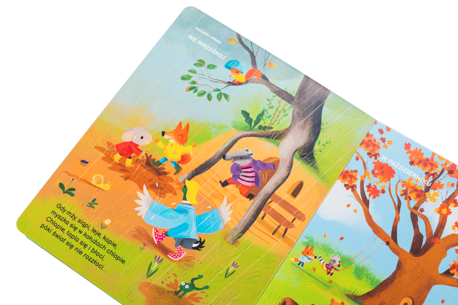 Pełne szczegółów i humoru, całostronicowe ilustracje poprowadzą małego czytelnika przez kolejne miesiące roku. Zobaczy, jak sympatyczna bohaterka bawi się w chowanego między kwitnącymi krzewami, kąpie w chłodnym jeziorze, skacze w kaloszach po kałuży i bierze udział w bitwie na śnieżki.