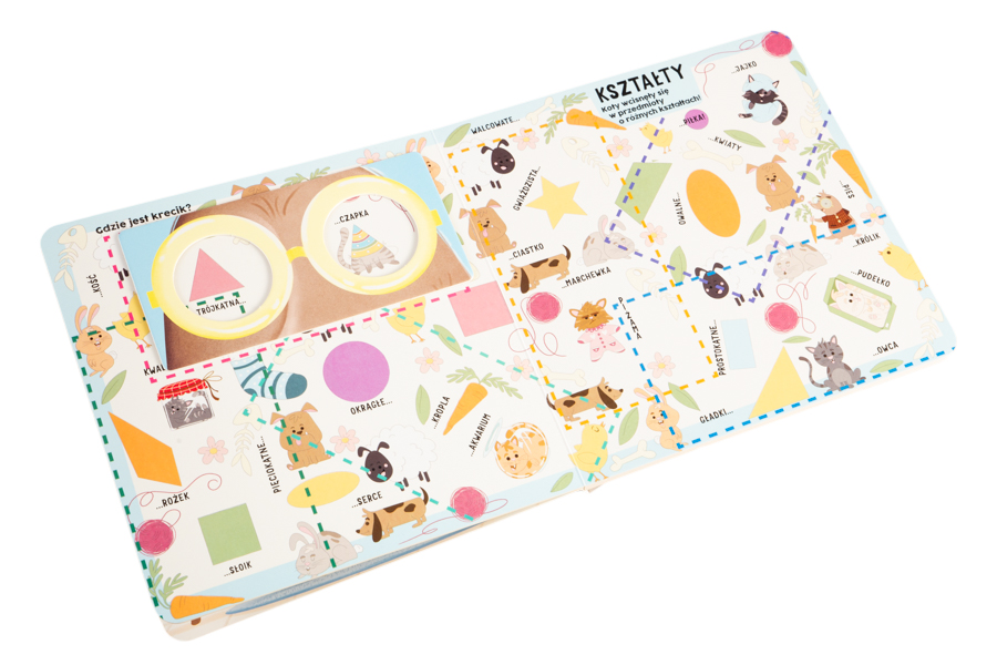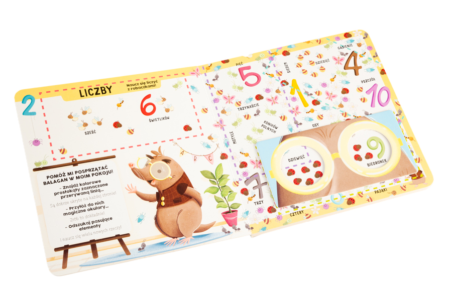 Na kolejnych stronach mały czytelnik będzie przykładał magiczne okulary, żeby wyszukiwać i porządkować: liczby, kolory, emocje, kształty i przeciwieństwa. Dzięki temu utrwali swoją wiedzę, a przy okazji rozwinie spostrzegawczość i koordynację.