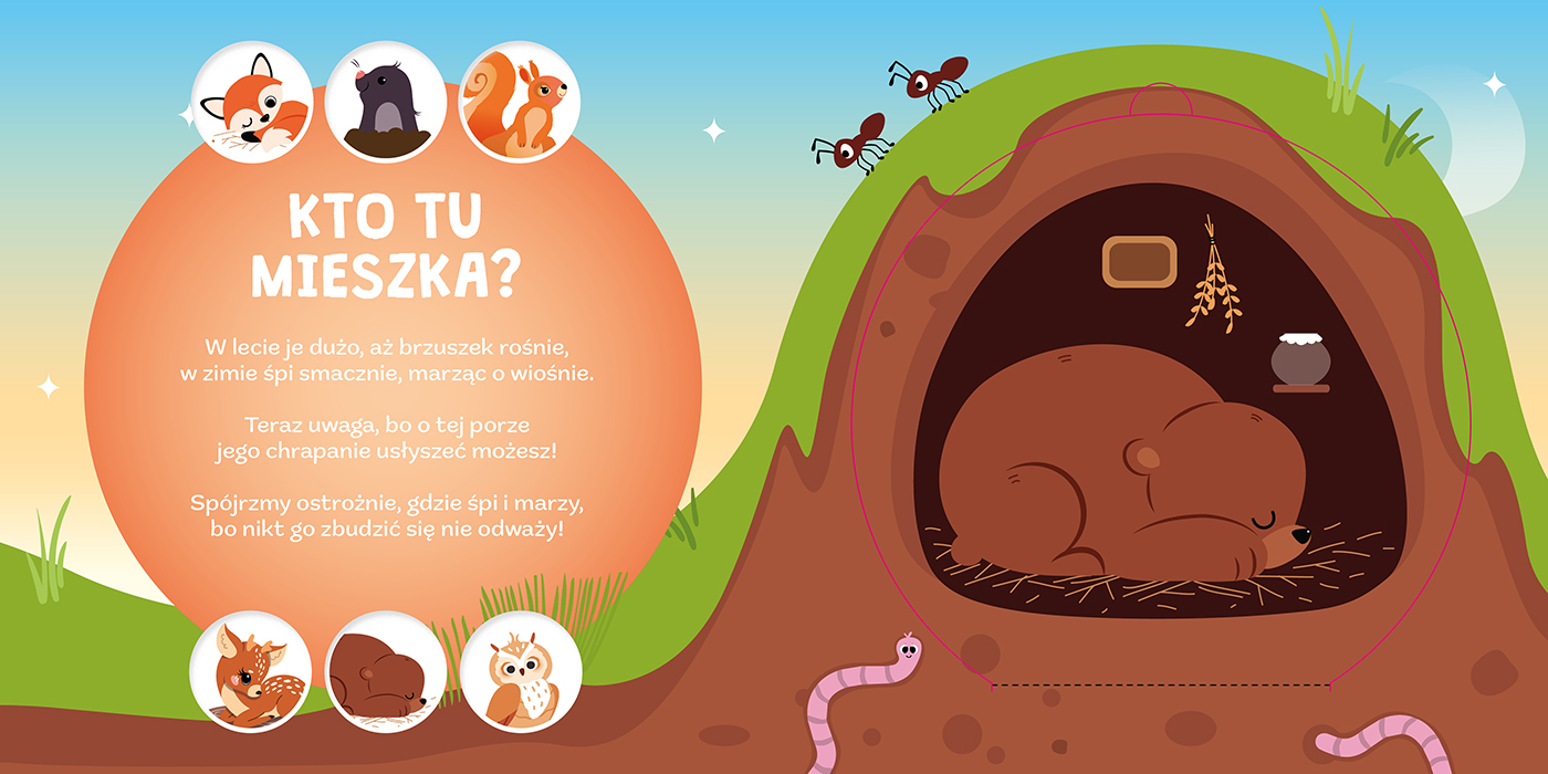 Czy jesteście ciekawi, kto mieszka w lesie? Przekonajcie się, jakie zwierzęta mają swoje domy w dziupli drzewa, w podziemnej jamie albo pośród zielonych gałęzi. Sami będziecie odkrywać wszystkie te miejsca, podnosząc okienka i zaglądając do kryjówki sowy, niedźwiedzia, lisa i innych zwierząt. W odkrywaniu siedzib mieszkańców lasu pomogą wam zabawne rymowanki i piękne ilustracje.