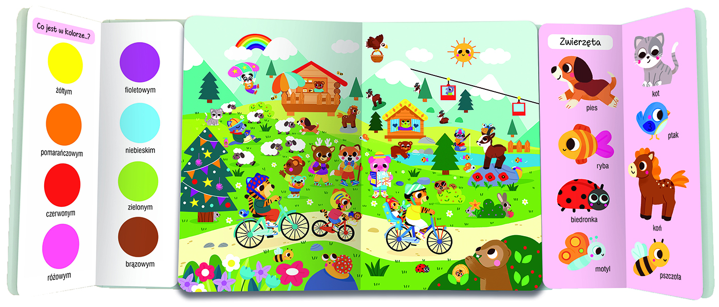 Dwie książeczki po bokach proponują różne elementy do znalezienia, między innymi kolory, kształty, liczby, zwierzęta. Co ciekawe, każdy element z bocznych książeczek można wyszukać na dowolnej scence! To daje mnóstwo możliwości przeróżnych odkryć. Dobrej zabawy!