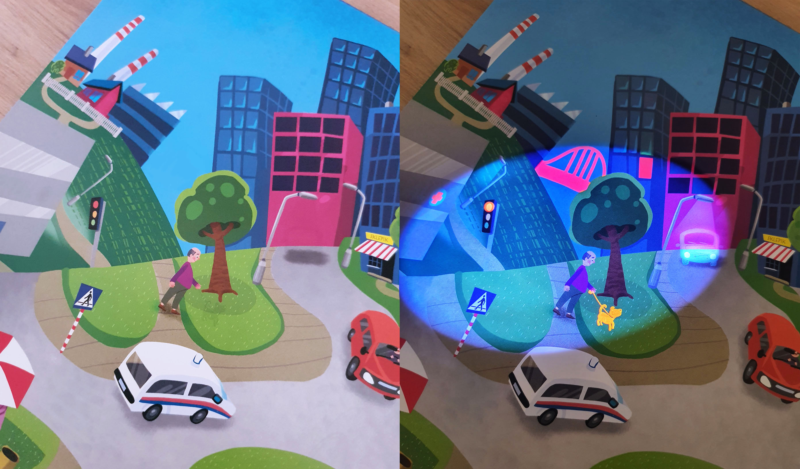 Do książki jest dołączona latarka wyzwalajaca obrazy pokryte farbą fluorescencyjną.
