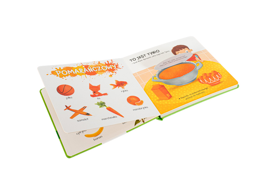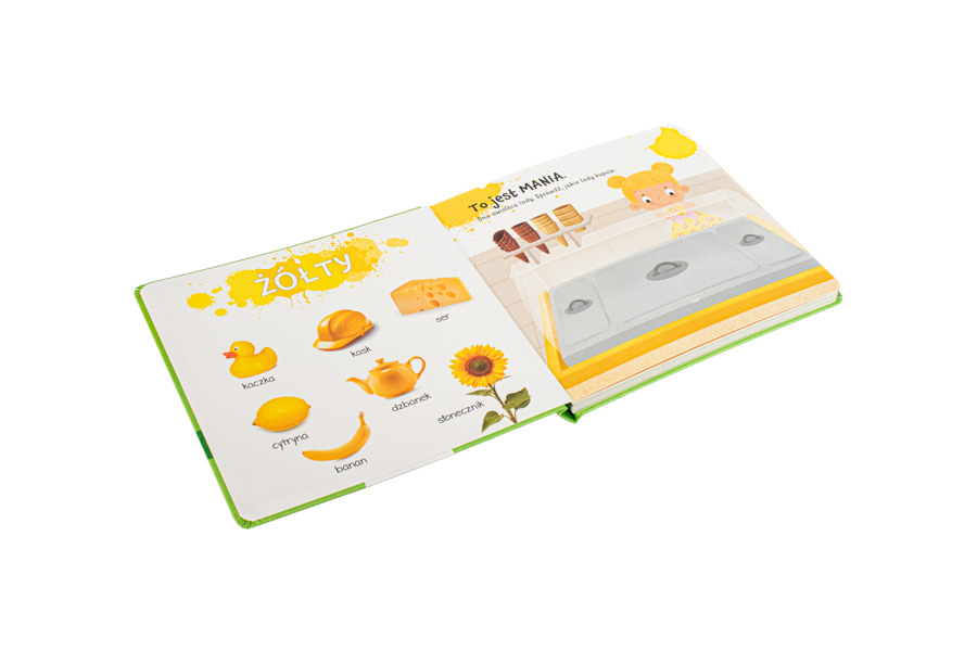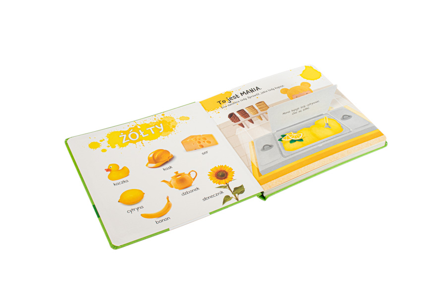 Przewodnikami po świecie barw są Mania i Tynio – sympatyczne rodzeństwo. Mały czytelnik najpierw poznaje kolor, oglądając fotografie różnorodnych przedmiotów, a następnie, podążając za bohaterami, odkrywa kolory na pełnych radości, pozytywnej energii i rodzinnego ciepła ilustracjach. Zostały one stworzone przez Agnieszkę Matz – uznaną ilustratorkę książek dla najmłodszych. Każda scenka kryje w otwieranym okienku przepyszną zagadkę, którą maluch z ciekawością rozwiązuje. Sprawdza, jakie lody wybrała Mania, zagląda do lodówki, żeby odkryć pozostawiony tam deser, otwiera piknikowy kosz albo dowiaduje się, co wnuki podarowały dziadkowi.