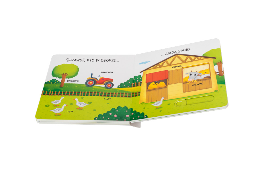 Mały czytelnik dowie się, jakie zwierzęta mieszkają w gospodarstwie. Nauczy się również wielu nowych słow i sprawdzi, kto mieszka w chlewiku, kto je siano i ile kurczątek wykluło się w kurniku.