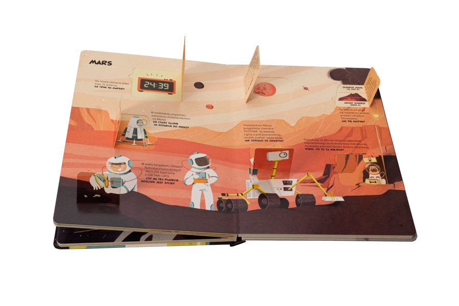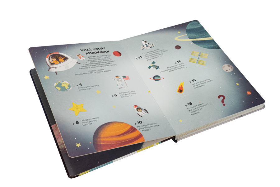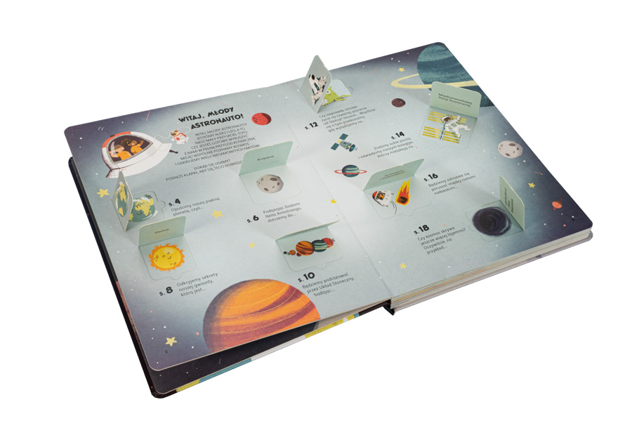 Dzieci poznają odpowiedzi na wiele pytań, m.in. Skąd przylatują komety? Jak wygląda życie wewnątrz stacji kosmicznej? Co by się stało, gdybyśmy znaleźli się zbyt blisko czarnej dziury? Podnosząc klapki, znajdą również mnóstwo ciekawostek o Układzie Słonecznym i niesamowitych tajemnicach kosmosu.