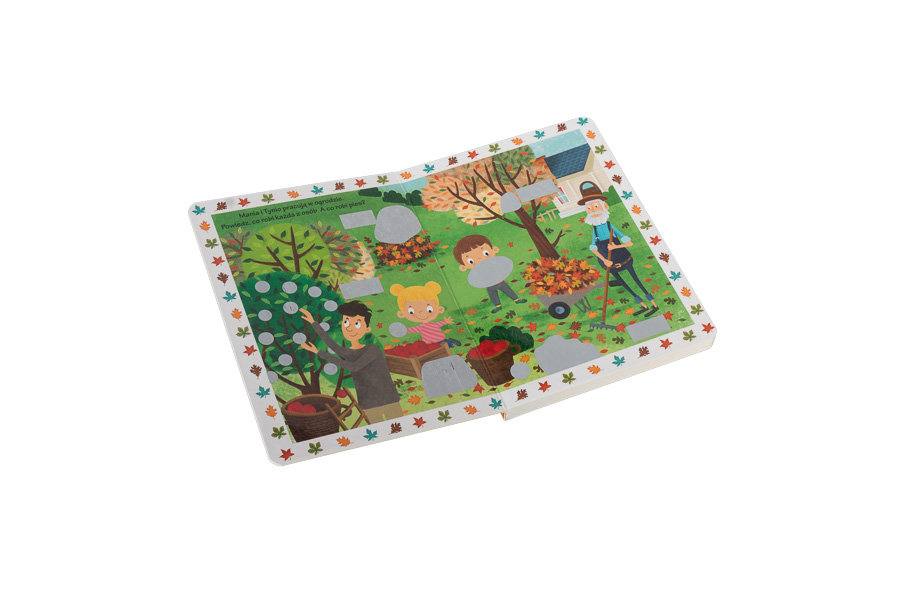 Przy każdej ilustracji jest zamieszczone polecenie, które rozwija pamięć, spostrzegawczość i logiczne myślenie. Etykietki z wyrazami wspierają rozwój mowy i można je wykorzystać na wczesnym etapie czytania globalnego.