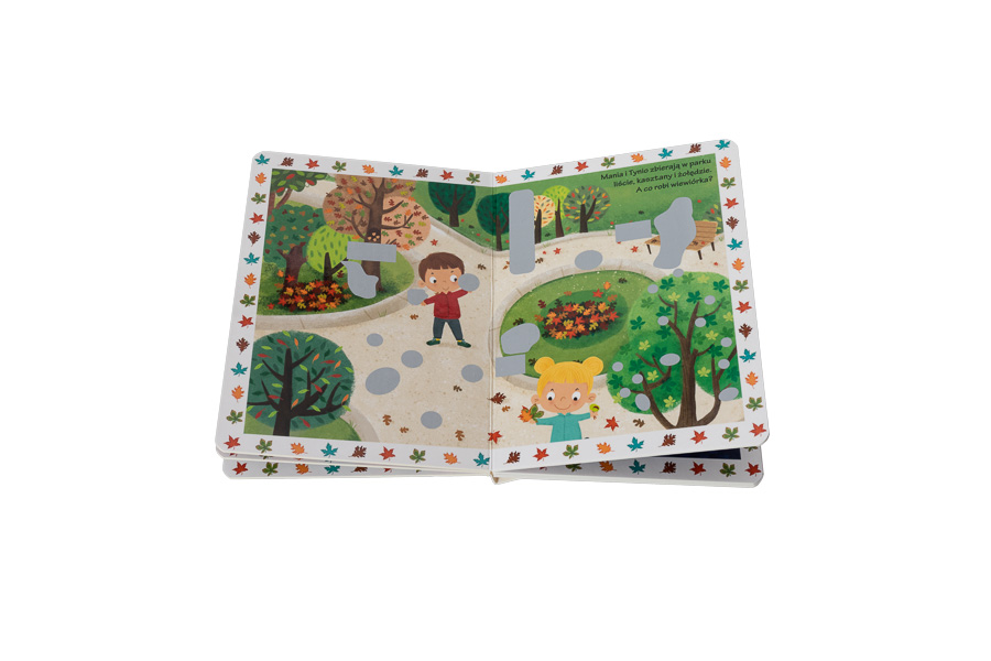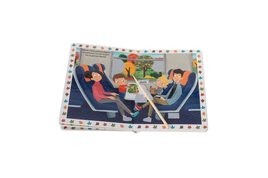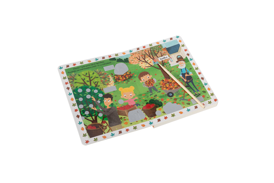 Zdrapywanki z Manią i Tyniem. Jesień ma poręczny format i poprzez zabawę wspiera rozwój manualny najmłodszych. Używając patyczka, dzieci zdrapują srebrną farbę i odkrywają całą ilustrację. To doskonały trening koncentracji. Dzieci, towarzysząc bohaterom, poznają jesień i jej oznaki. Będą jechać pociągiem, zbierać w parku dary jesieni i bawić się na deszczu.