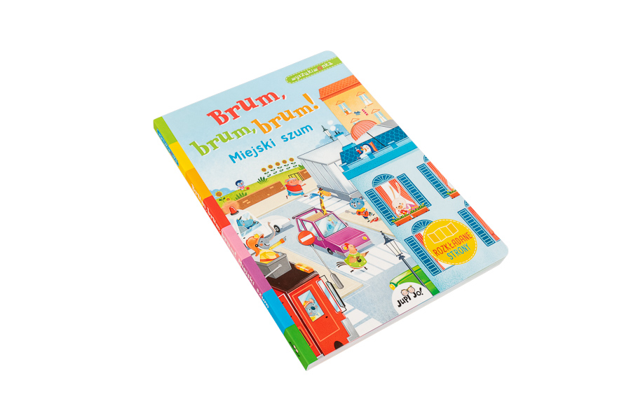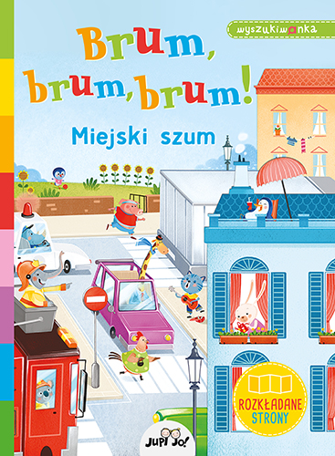 Brum, brum, brum! Miejski szum to duża, świetnie zilustrowana, książka-wyszukiwanka, w której dziecko podąża za autem pana Żyrafy, poznaje rozmaite pojazdy i szuka wskazanych obiektów. Z każdą kolejną stroną na ulicach jest coraz większy ruch. Trwa policyjny pościg, rozpoczęła się akcja gaśnicza straży pożarnej, pocztowe furgonetki wiozą przesyłki. Wyzwanie kończy się, kiedy powstaje…wielki korek! Mali czytelnicy zobaczą go na rozkładanych stronach.