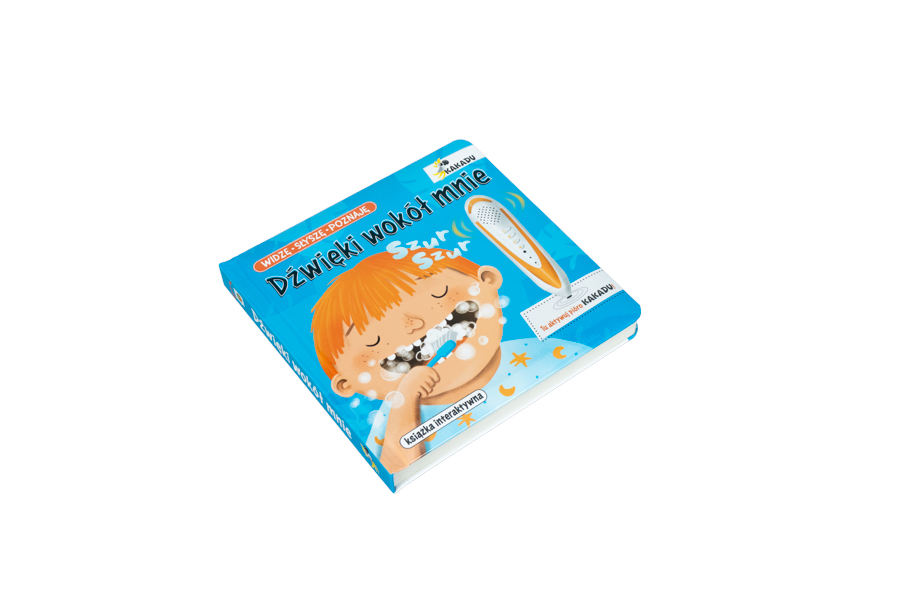 Dźwięki wokół mnie to książka interaktywna z piórem Kakadu, które uruchamia zakodowane na stronach teksty i dźwięki. Publikacja jest częścią innowacyjnego systemu nauki i zabawy w jednym. Maluch usłyszy i pozna 24 dźwięki swojego najbliższego otoczenia, między innymi: odgłosy mycia zębów, kapiącej wody, klaskania, chrupania czy dawania całusa. Świetne ilustracje Beaty Żurawskiej oraz zapisane na każdej stronie wyrazy dźwiękonaśladowcze zachęcają do zabawy, poznawania świata i rozwijania słownictwa.