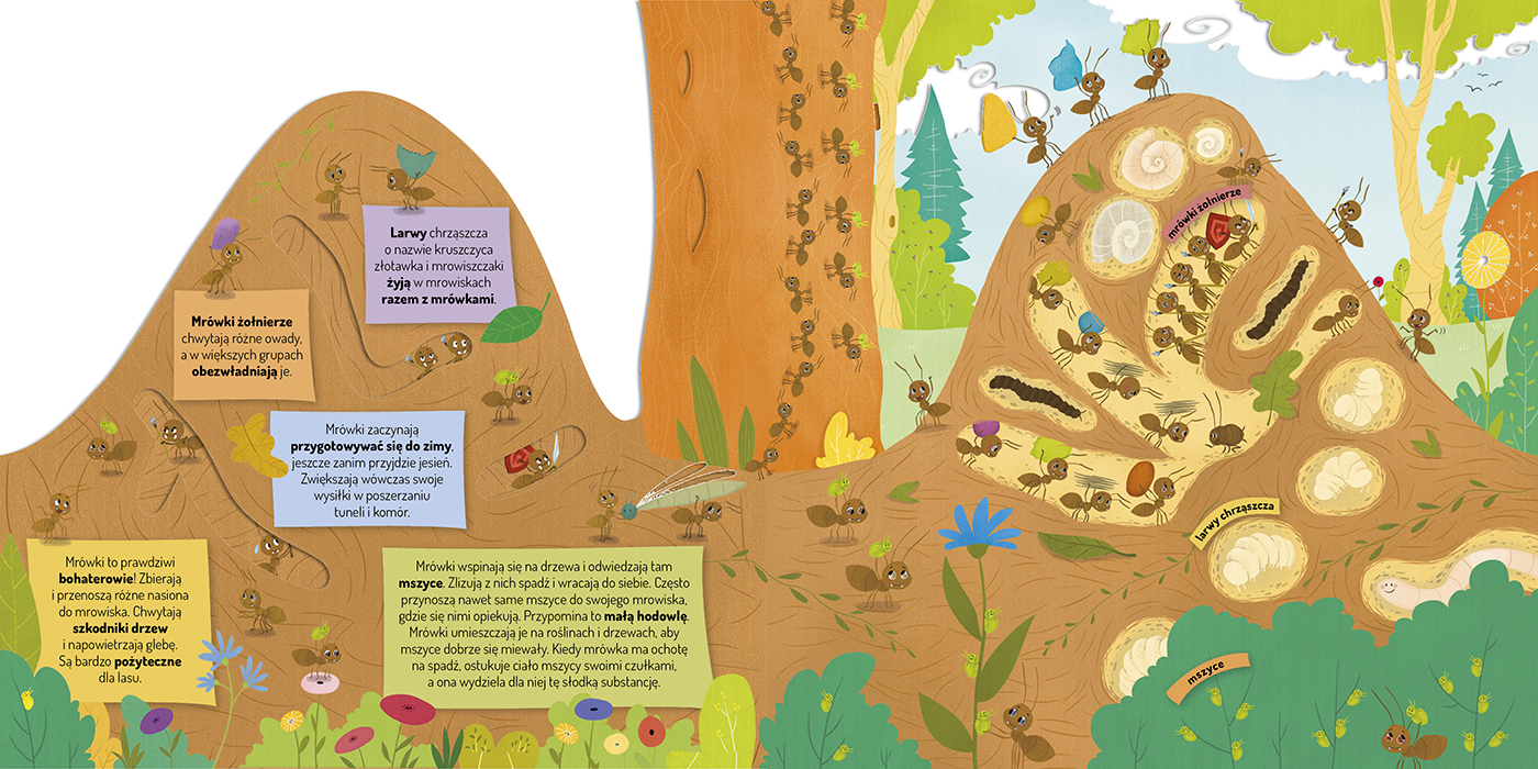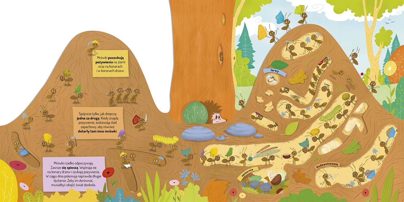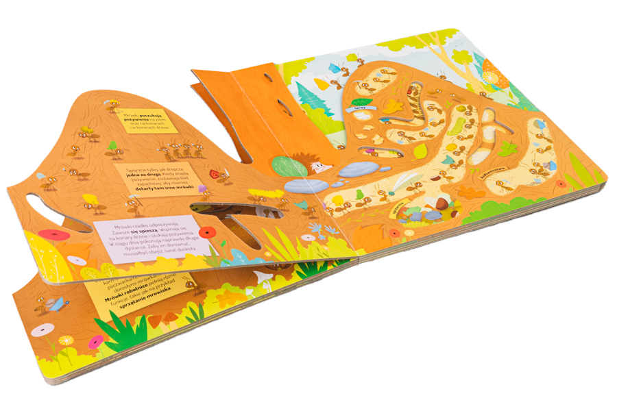 Urocza kartonowa książeczka z pomysłowymi wycięciami zaprasza dzieci do fascynującego świata mrówek. Dzięki jej barwnym i pełnym humoru stronom dzieci poznają wiele frapujących ciekawostek i poczują się, jakby zaglądały do wnętrza mrowiska. Och! Ale mrówki! Ale zabawa! Bajecznie kolorowe strony książeczki zaciekawią dzieci otaczającym je światem i pięknem przyrody i zapewnią im rozwijającą i bezpieczną rozrywkę.