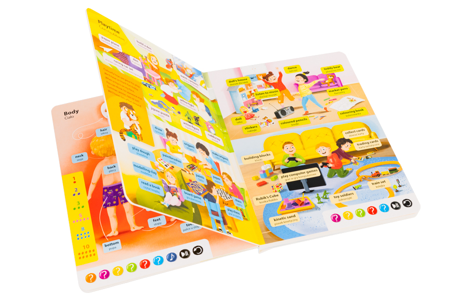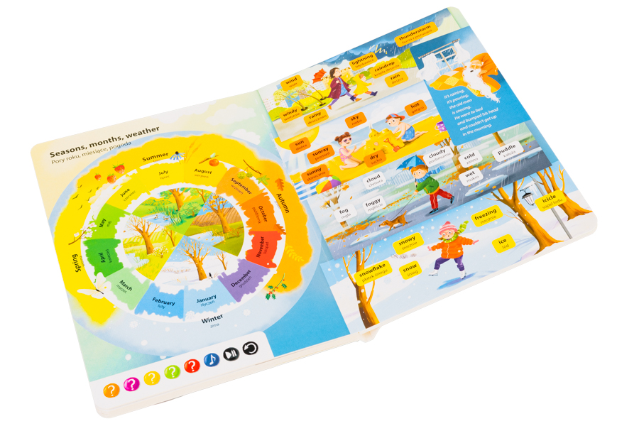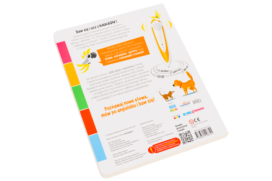 500 słów i zwrotów. Angielski słowniczek obrazkowy to książka interaktywna, która uruchamia zakodowane na stronach teksty i dźwięki za pomocą pióra Kakadu. Publikacja jest częścią innowacyjnego systemu nauki i zabawy w jednym. Zawiera bliskie dziecku słowa, wyrażenia i zwroty pogrupowane w następujących działach: Czas na zabawę; Rodzina; Ciało; Kolory i kształty; Pory roku, miesiące, pogoda; Przeciwieństwa, Aktywności na świeżym powietrzu, Przyroda.