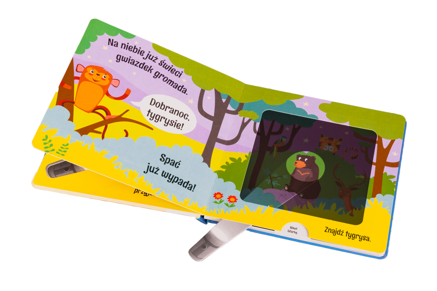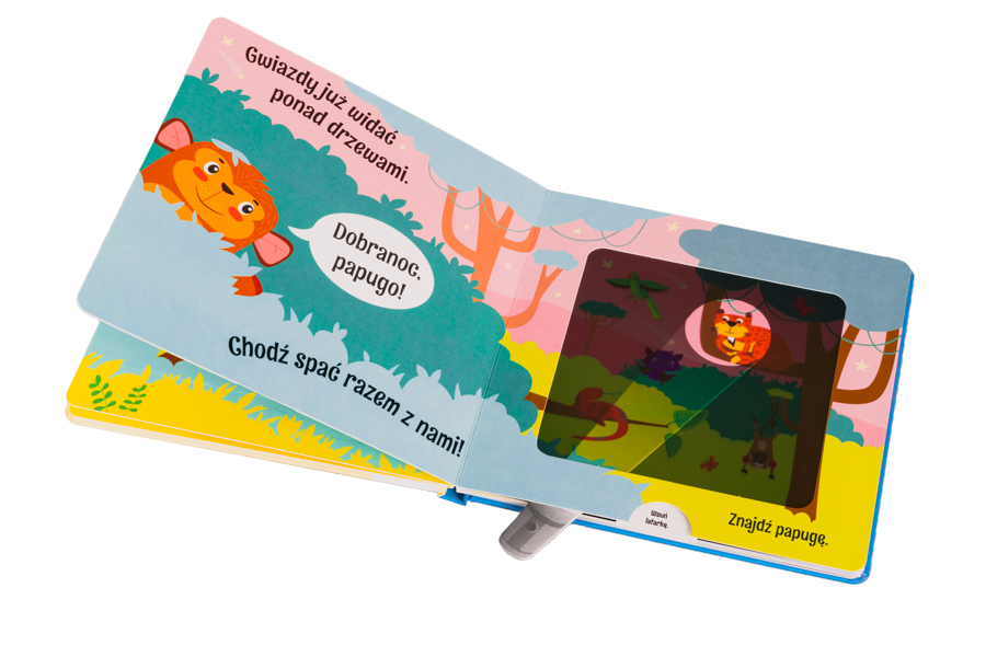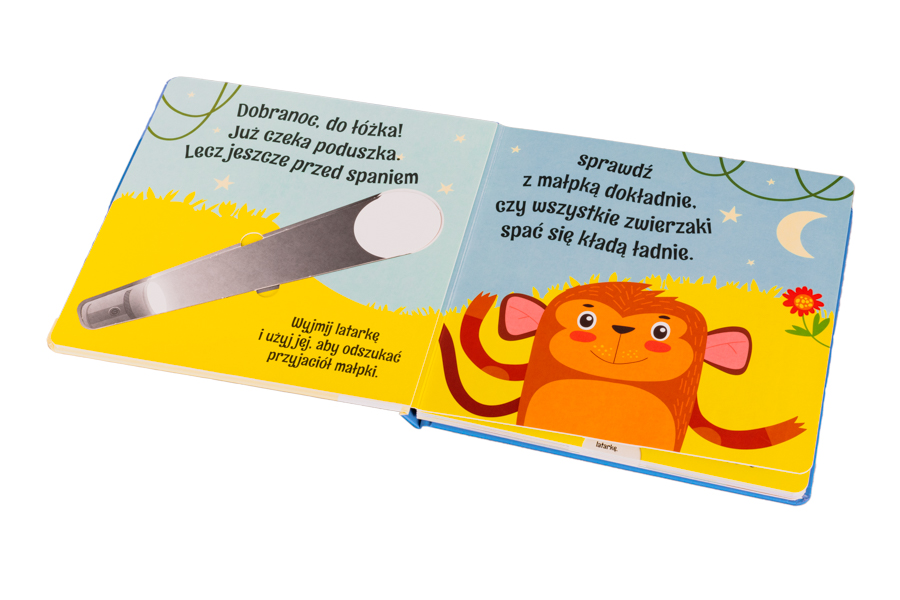 Małpka chce iść spać, ale zanim to zrobi, musi powiedzieć dobranoc innym zwierzętom. Pomożesz je znaleźć? Wyjmij znajdującą się w książce kartonową latarkę, weź ją do ręki, wsuń pod ciemną folię i rzuć światło na bohaterów książeczki. Słuchając rymowanej opowiastki, szukaj z małpką jej przyjaciół na kolejnych stronach. Czy udało ci się znaleźć wszystkie zwierzęta? Małpka usnęła, a ty?