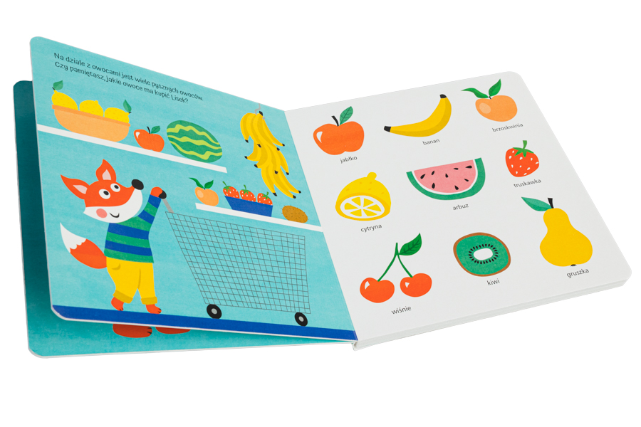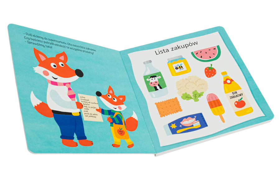 Tata narysował Liskowi listę zakupów i razem idą do supermarketu. Mały czytelnik będzie towarzyszył im w sklepie, pozna różne produkty i porówna je z listą zakupów. Mleko czy jogurt? Banany czy truskawki? Mydło czy pasta do zębów? Sprawdźmy, czy Lisek włożył do koszyka wszystko z listy zakupów!