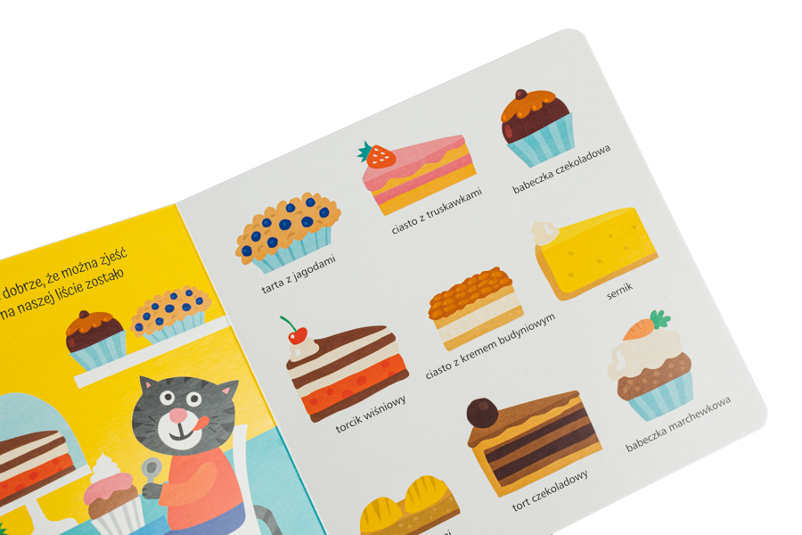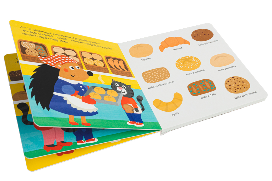 Mama narysowała małemu Kotkowi listę zakupów i razem wybierają się do piekarni. Mały czytelnik będzie miał okazję obserwować pracę piekarza, pozna różne rodzaje wypieków i porówna je z listą zakupów. Chleb pszenny czy razowy? Bułka wieloziarnista czy bagietka? Pączek czy babeczka? Sprawdźmy, czy to, co wybierze Kotek znajduje się na liście zakupów!