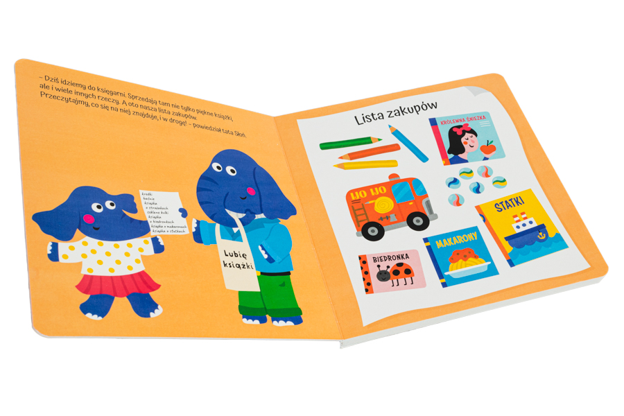 Tata narysował Słoniczce listę zakupów i razem wybierają się do księgarni. Mały czytelnik będzie towarzyszył im podczas zakupów, pozna różne rodzaje książek i artykułów papierniczych. Książka z puzzlami czy książka dźwiękowa? Książka o statkach czy o dinozaurach? Kredki czy ołówek? Sprawdźmy, czy Słoniczka kupiła wszystko z listy zakupów!