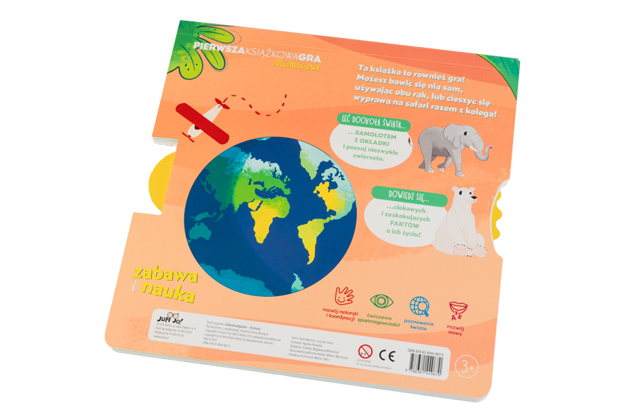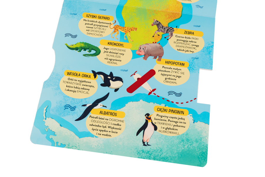 Integralną częścią tej wyjątkowej książki jest umieszczona w okładce gra zręcznościowa, w której dziecko pilotuje samolot lecący dookoła świata i jednocześnie mija różne zwierzęta. Ta zabawa świetnie wpływa na rozwój motoryki, koordynacji i spostrzegawczości gracza. Na kolejnych stronach młody czytelnik pozna zwierzęta zamieszkujące poszczególne kontynenty i odkryje zaskakujące fakty o ich życiu.