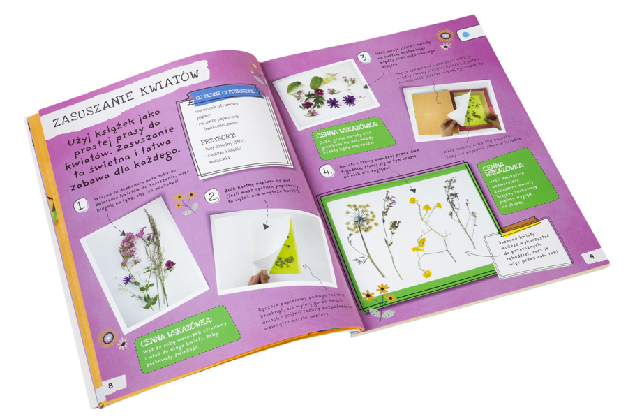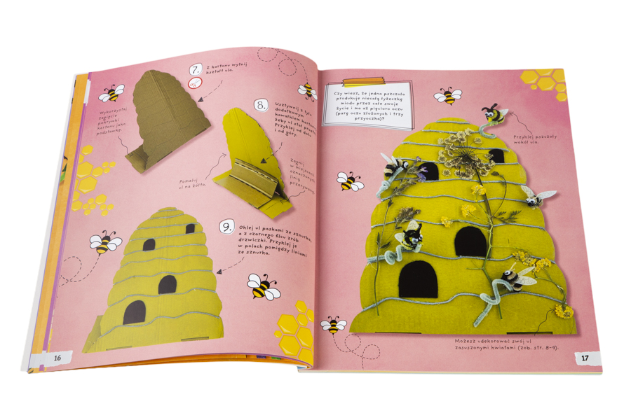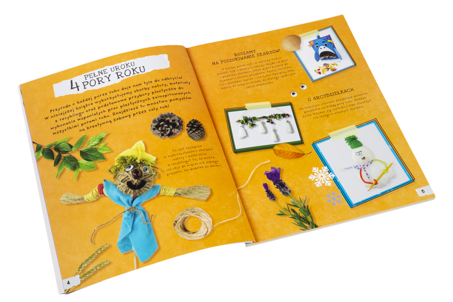 Dzięki świetnym i superprostym pomysłom w niej zawartym będziemy mogli zrobić karmnik dla ptaków, hotel dla owadów, pojemnik na kredki, pudełko na cukierki, magnesy na lodówkę, duszki z wełny, jesienną dynię, doniczkowego stracha na wróble, szyszkową sowę i jeszcze wiele innych ciekawych, efektownych i przydatnych przedmiotów. Do stworzenia naszych arcydziełek wykorzystywać będziemy skarby natury (takie jak kasztany, trawę lub patyczki) i przedmioty codziennego użytku (takie jak puste kartony, spinacze do bielizny czy gąbki do naczyń) – to pomoże nam docenić naturę i rozwinie naszą inwencję twórczą.