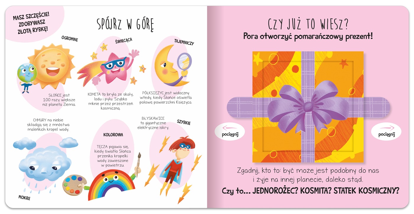 Jak żyliśmy w przeszłości? W jakich domach mieszkają ludzie na całym świecie? Jakie są najlepsze wynalazki wszechczasów? Tego i wiele więcej dowie się młody czytelnik, a następnie będzie otwierał trójwymiarowe pudełka upominkowe, odpowiadał na pytania i sprawdzał, co już wie. To dopiero frajda! Bo zdobywanie wiedzy jest równie przyjemne jak otwieranie prezentów.