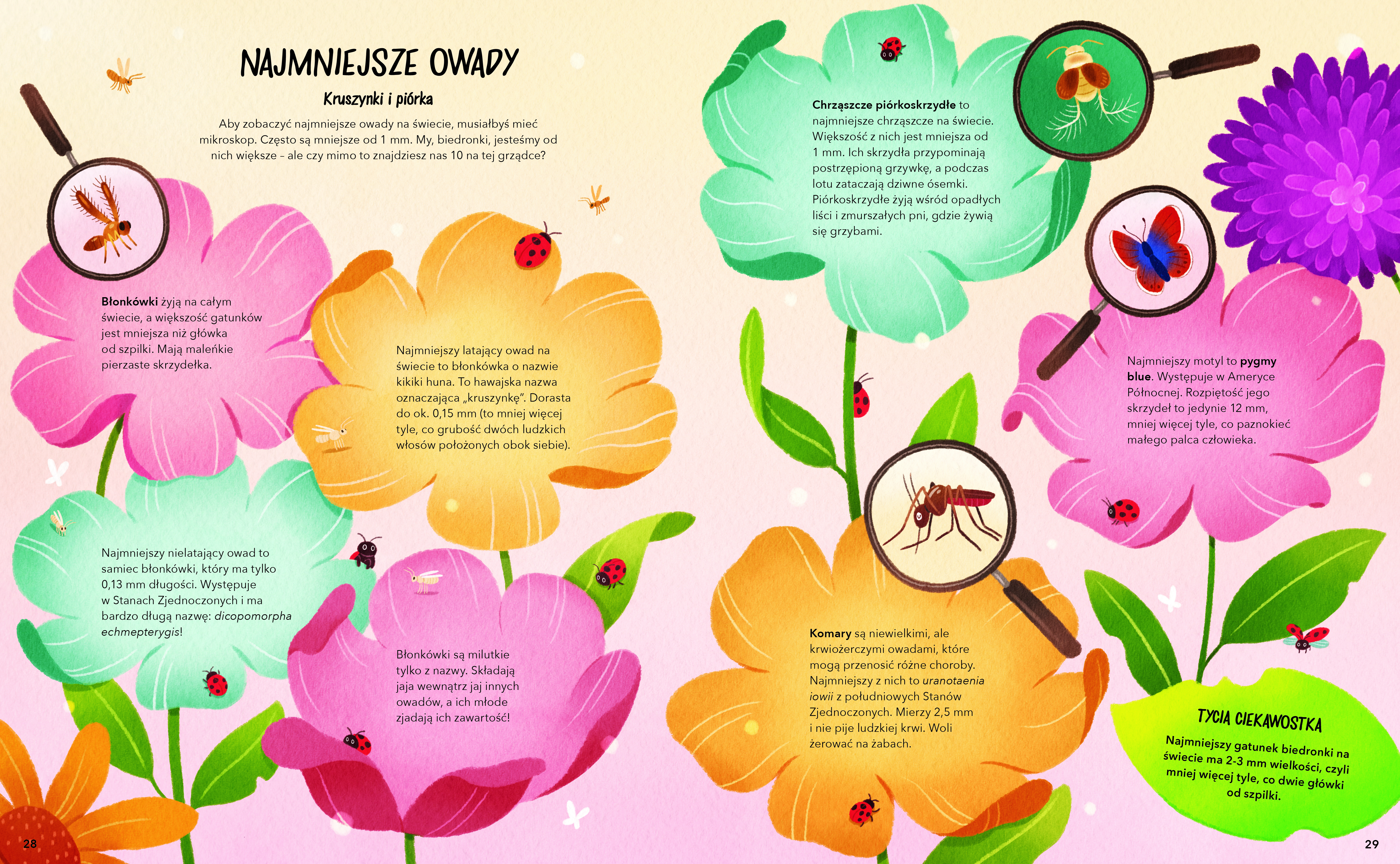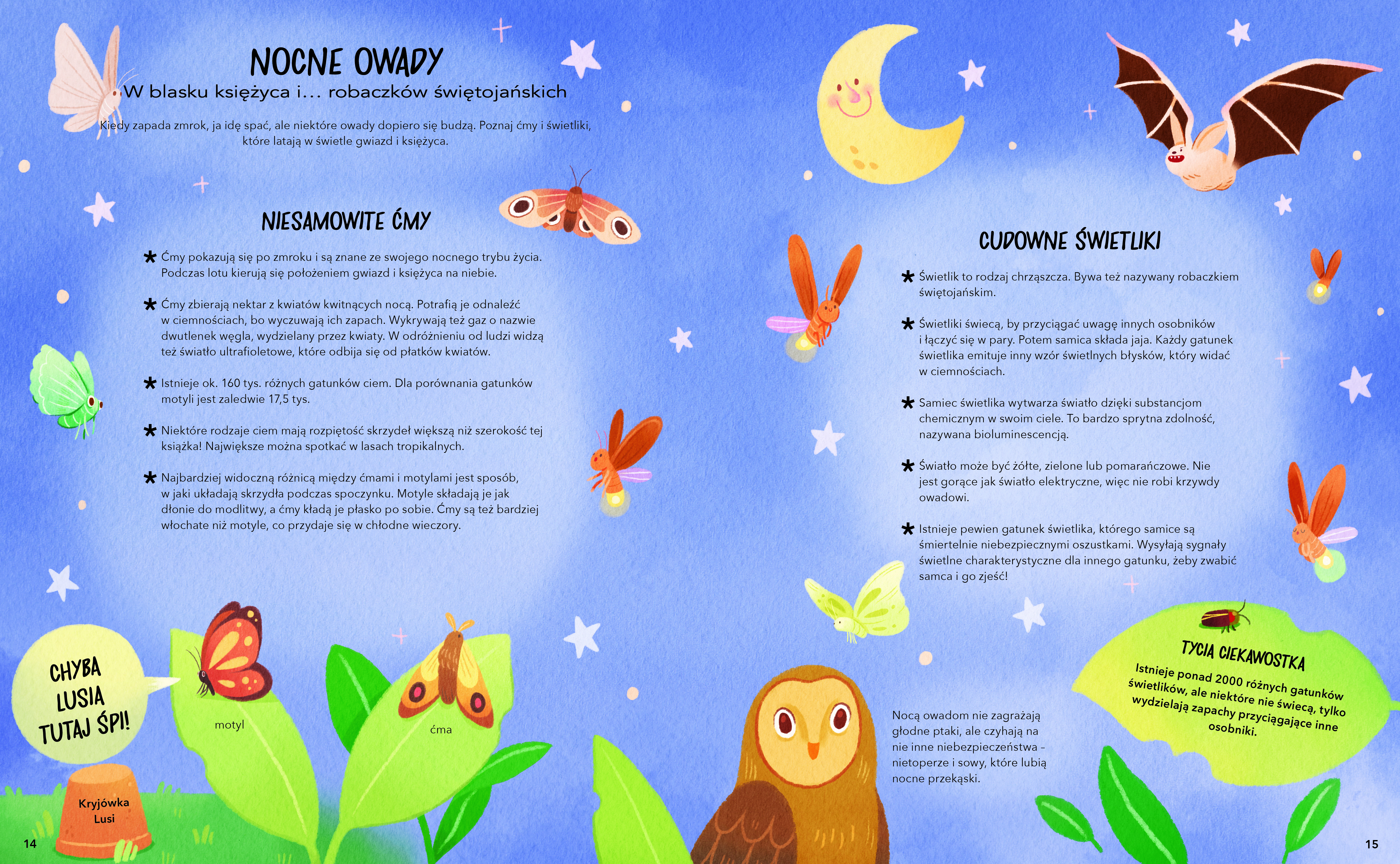 W oryginalny sposób przedstawia wiele przyrodniczych ciekawostek. Dzięki niej dzieci dowiedzą się, jak zbudowane są owady, jak wyglądają ich domy i co charakteryzuje ich środowisko życia. Poznają m.in. nakrapiane biedronki, mieniące się wszystkimi kolorami tęczy motyle, pracowite mrówki, świetliki świętojańskie, chrabąszcze, cykady, patyczaki, wytwarzające miód pszczoły i egzotyczne modliszki… Och, nie sposób wymienić wszystkich owadów, których sekrety odsłoni przed nami ta wspaniała publikacja. Dzięki informacjom w niej zawartym mali czytelnicy uświadomią sobie, że owady nie tylko są fascynujące, ale i niezbędne dla ludzi, zwierząt, roślin i całego środowiska.