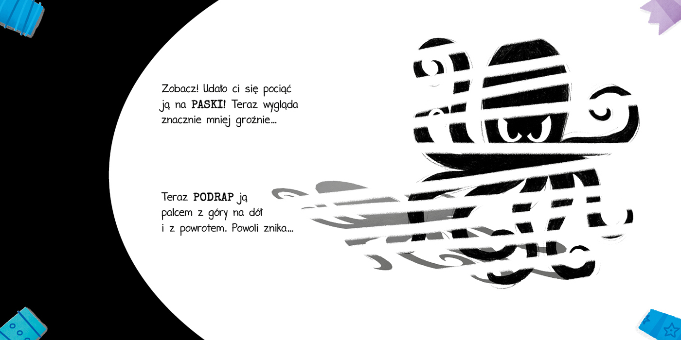 Czy pomożesz Lusi stawić czoła jej lękom? Otwórz tę książeczkę ze strachami i podążaj za Lusią. Wykonuj proponowane zabawy i przepędź wszystkie potwory. Potem zamknij książkę, skoncentruj się i zbierz się na odwagę. Połóż kciuk na krawędzi książki i szybko ją przekartkuj. Zobaczysz, jak potwory znikają z książki… naprawdę! Ale lęk nigdy nie znika całkowicie, trzeba nauczyć się stawiać mu czoła każdego dnia.