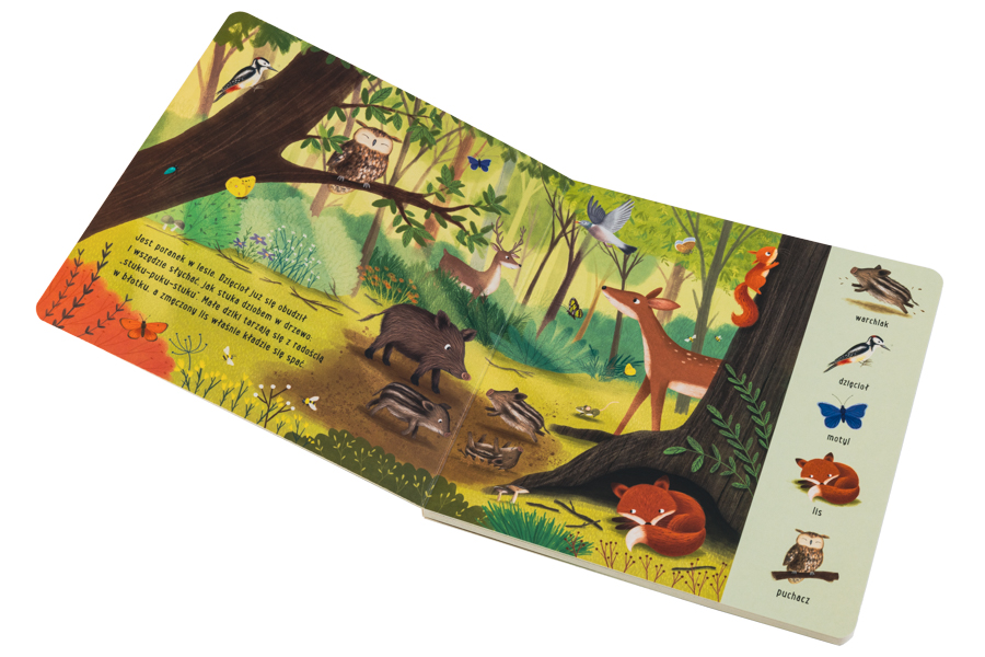 Cały las w jednej książce – w dzień, w nocy i przez cztery pory roku: co to za ptak tak głośno puka o poranku? Gdzie ukrywa się ciekawska mysz? Mali przyrodnicy dzięki tej kolorowej publikacji będą oglądać zwierzęta, takie jak wiewiórki, borsuki czy lisy, i obserwować ich zachowanie.