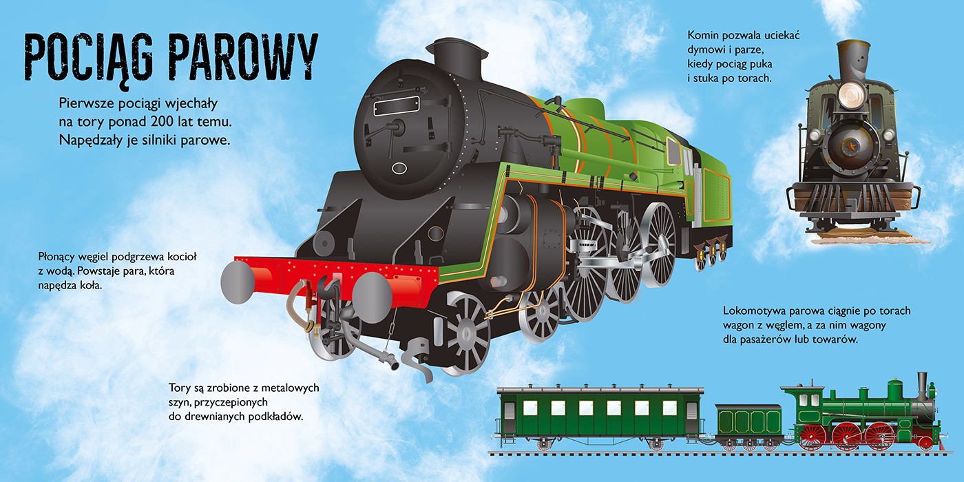 Książka z serii POP-UP 10 czytelnicy zawiera 10 przestrzennych ilustracji, które przedstawiają różnorodne pociągi sprzed wielu lat, a także najbardziej zaawansowane technologicznie maszyny. Bogactwo interesujących informacji pomoże pogłębić wiedzę o tych pojazdach, zapewni inspirującą lekturę i doskonałą zabawę.