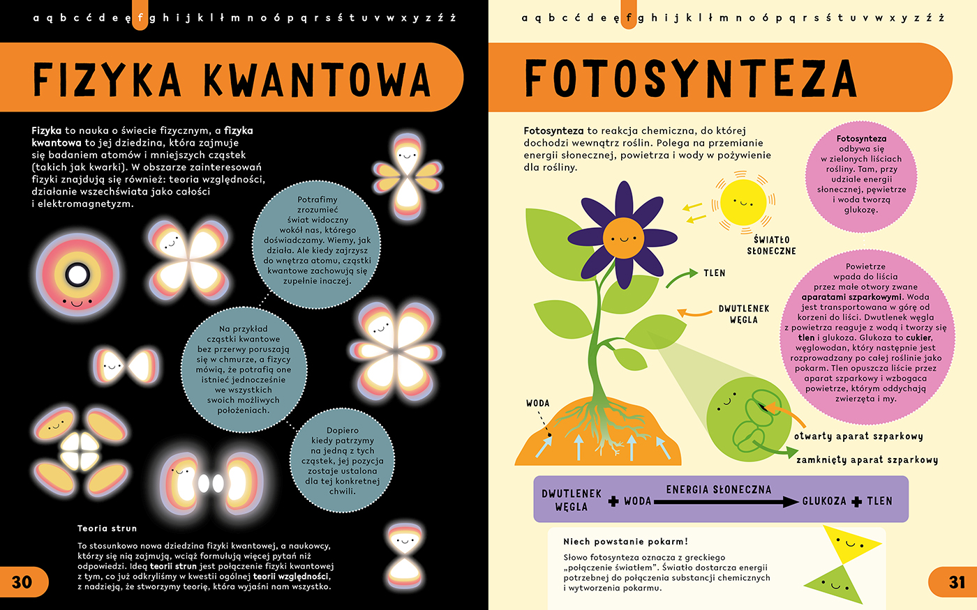 Odkrywajcie te i inne ważne terminy naukowe, kartkując tę kolorową Encyklopedię STEM. Znajdziecie w niej aż 100 pogrupowanych alfabetycznie pojęć, opatrzonych zabawnymi rysunkami. Każde dziecko, które pasjonuje się nauką, pozna mnóstwo ciekawych słów, takich jak Geometria, Hipoteza, Immunologia czy Jupiter, a nawet dowie się, czym jest Zero! Na początku encyklopedii napotkamy alfabetyczny spis pojęć, dzięki któremu łatwo odszukamy interesujący nas termin, a na końcu publikacji natrafimy na bogaty w hasła indeks.
