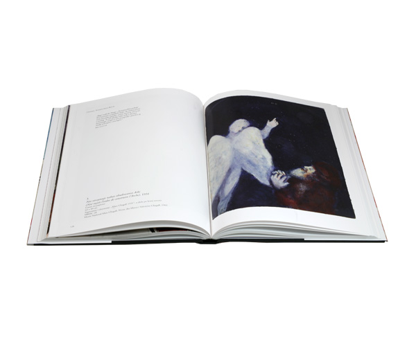 - profesjonalny, będący nowym spojrzeniem na dzieło Chagalla komentarz: opis zaprezentowanych prac artysty oraz eseje dotyczące jego inspiracji filozofią rosyjską XX w., odniesieniami do sztuki greckiej, rosyjskich ikon i zachodniego malarstwa.
