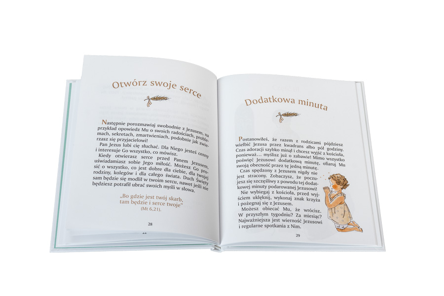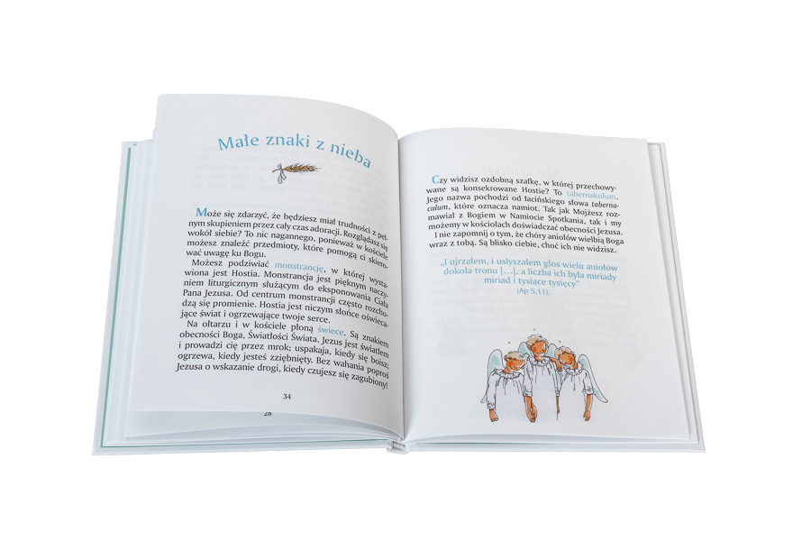 Ta ilustrowana książeczka zaprasza dzieci do uwielbiania Pana Jezusa obecnego w Najświętszym Sakramencie. Na jej 64 stronach znajdziemy wiele ciekawych informacji dotyczących kultu eucharystycznego, trafiające do dziecięcych serc rozważania oraz teksty modlitw i medytacje do wykorzystania podczas indywidualnych i wspólnotowych adoracji.