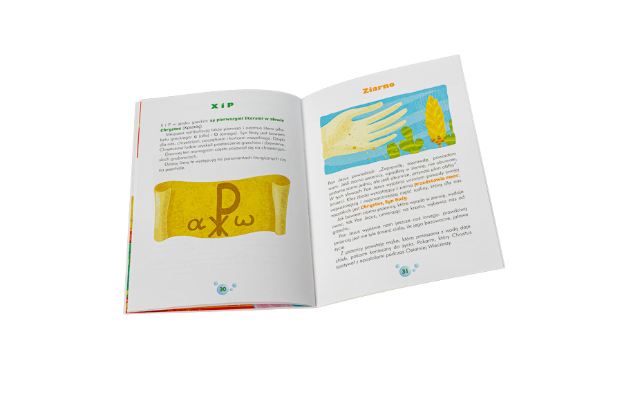 Na jej 32 stronach znajdziemy wiele informacji dotyczących takich symboli, jak: krzyż, gołębica, woda, chleb, palma, pelikan czy ryba. Wszystkie one zaznajamiają dzieci nie tylko z bogactwem tradycji chrześcijańskiej, ale także z ważnymi kodami kulturowymi.
