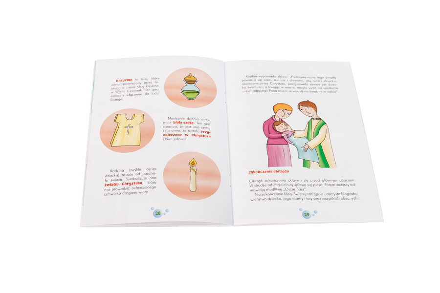 Ta mądra książeczka zaznajamia małych chrześcijan z sakramentem chrztu świętego. Objaśnia dzieciom jego wartość i piękno i zaprasza do radosnego przeżywania wiary chrześcijańskiej. Na jej 32 stronach znajdziemy mnóstwo cennych informacji przybliżających nam istotę chrztu. Publikacja wyjaśnia nam jego symbolikę i znaczenie i sprawia, że poszczególne części celebracji liturgicznej chrztu staną się dla nas zrozumiałe i pełne głębi.