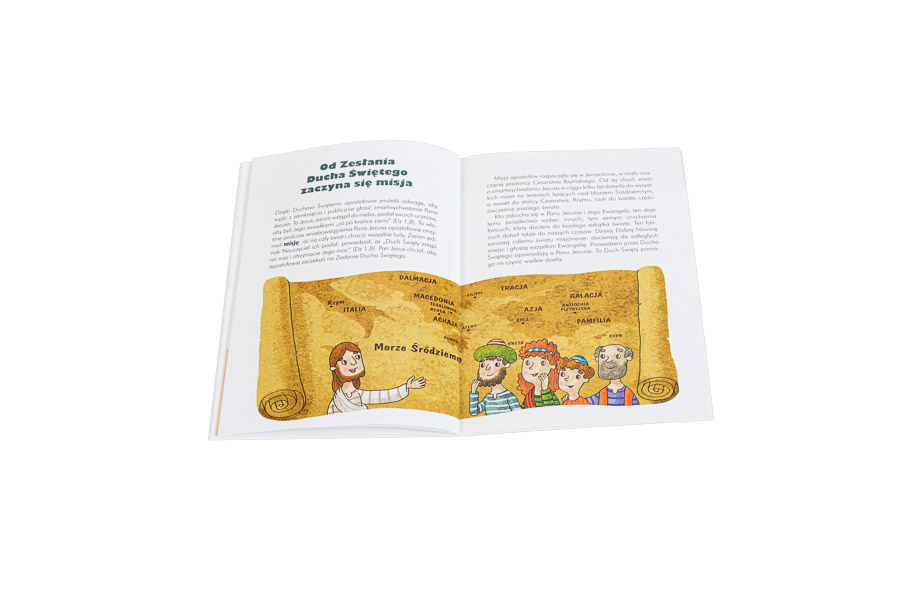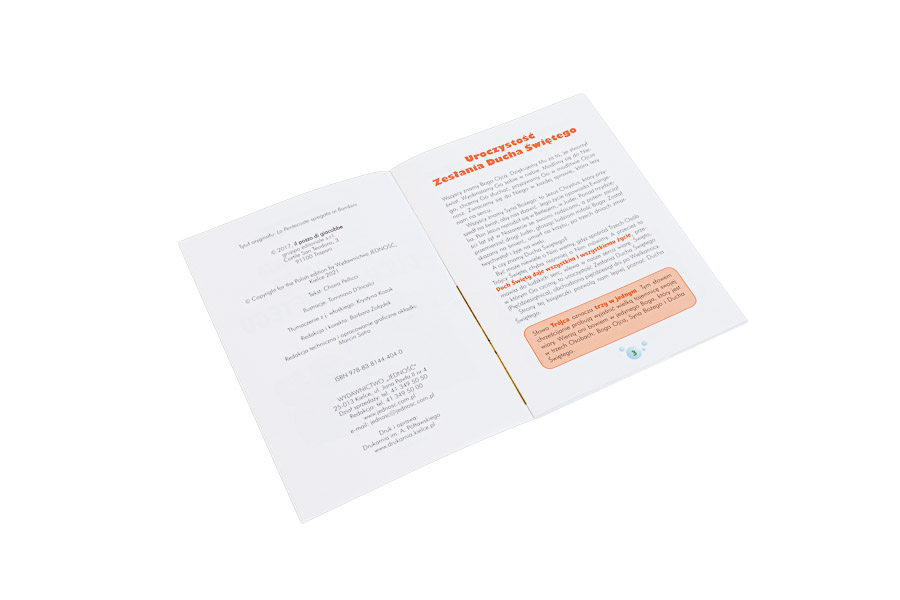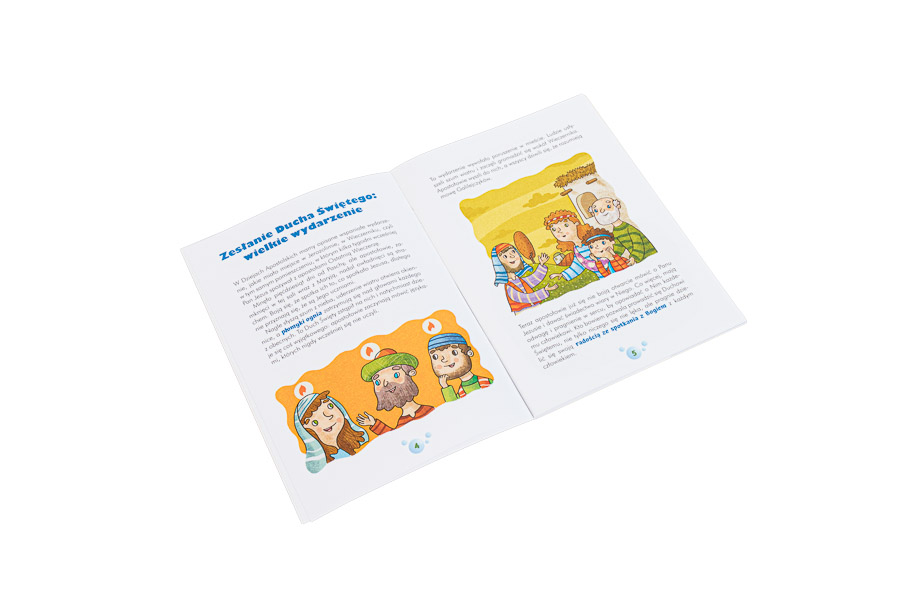 Ta książeczka objaśnia małym chrześcijanom uroczystość Zesłania Ducha Świętego. Zaznajamia dzieci z podstawowymi terminami liturgicznymi i przedstawia głównych bohaterów wydarzeń z Wieczernika. Na jej 32 stronach znajdziemy wiele ciekawych rozważań dotyczących siedmiu darów Ducha Świętego i owoców, jakie przynosi, ponadto nowennę oraz piękną sekwencję do Ducha Świętego, które ułatwią dzieciom przygotowanie się do Pięćdziesiątnicy.